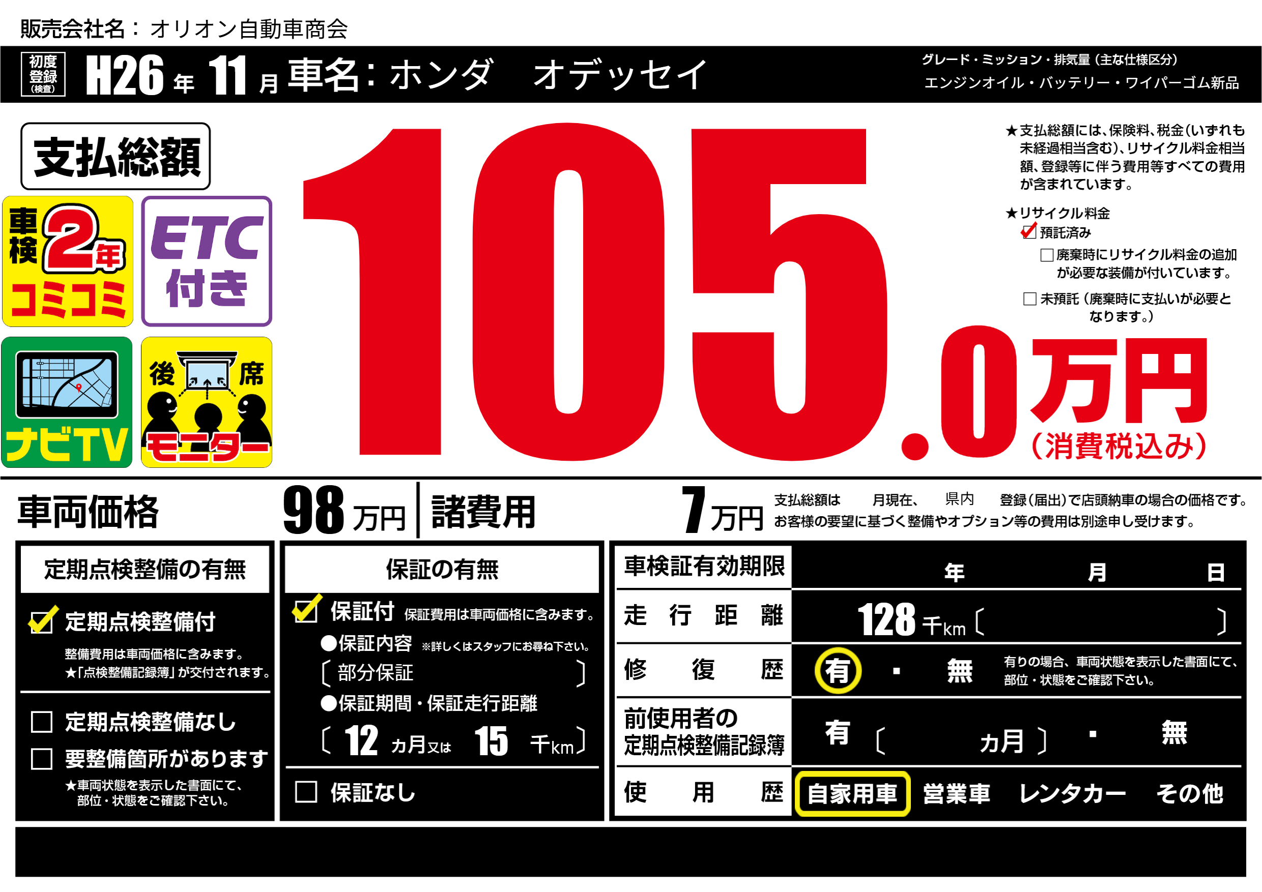 | 走行キロ | 12.8万km | 初年度登録 | H26年11月 |