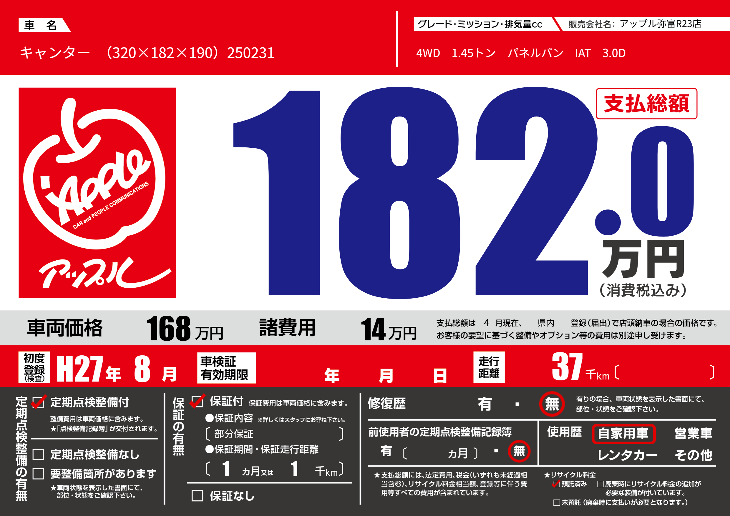 | 車名 | キャンター (320×182×190)250231 | グレード ミッション 排気量 |