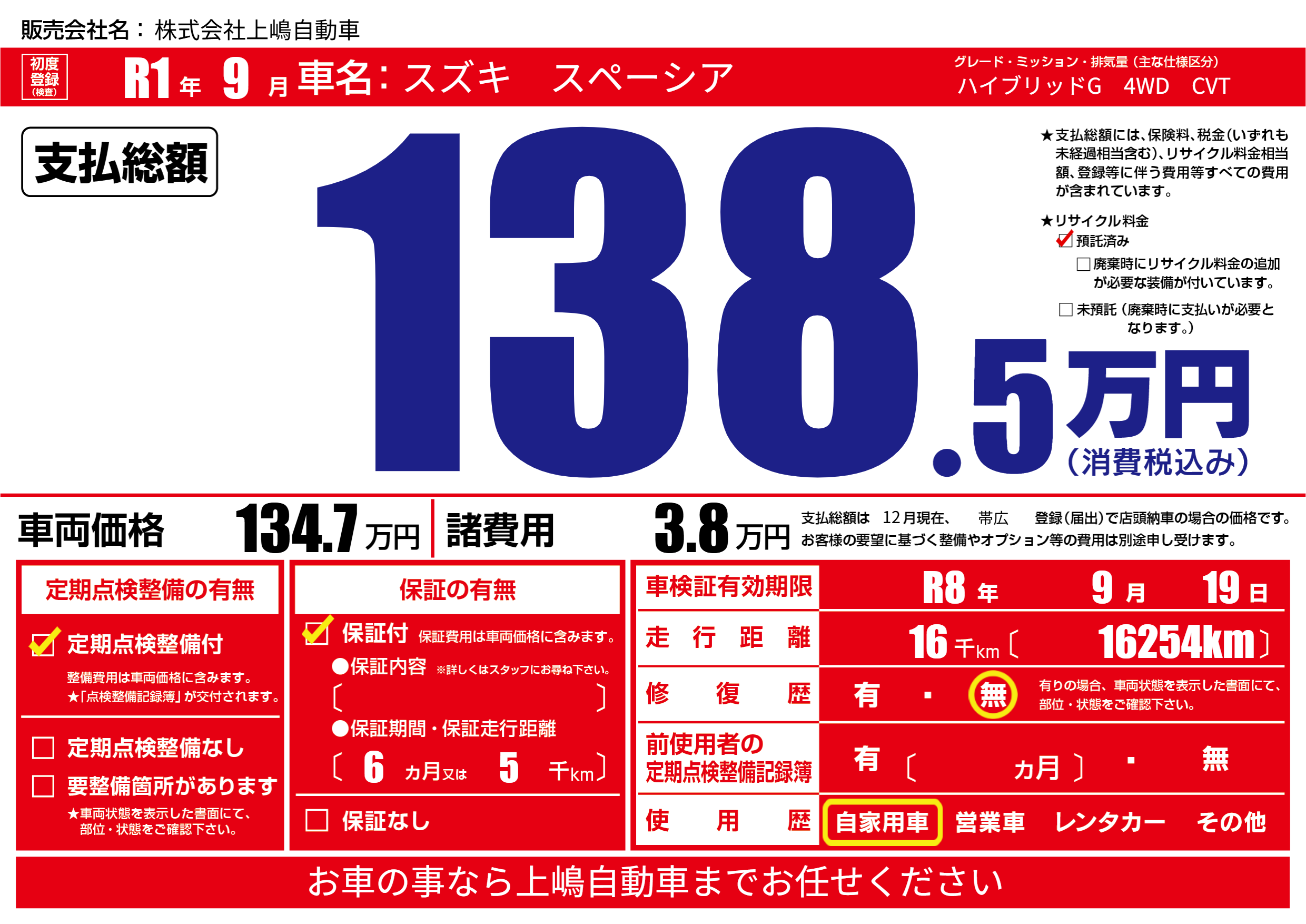 | 車名 | スズキ スペーシア | グレード ミッション 排気量 |