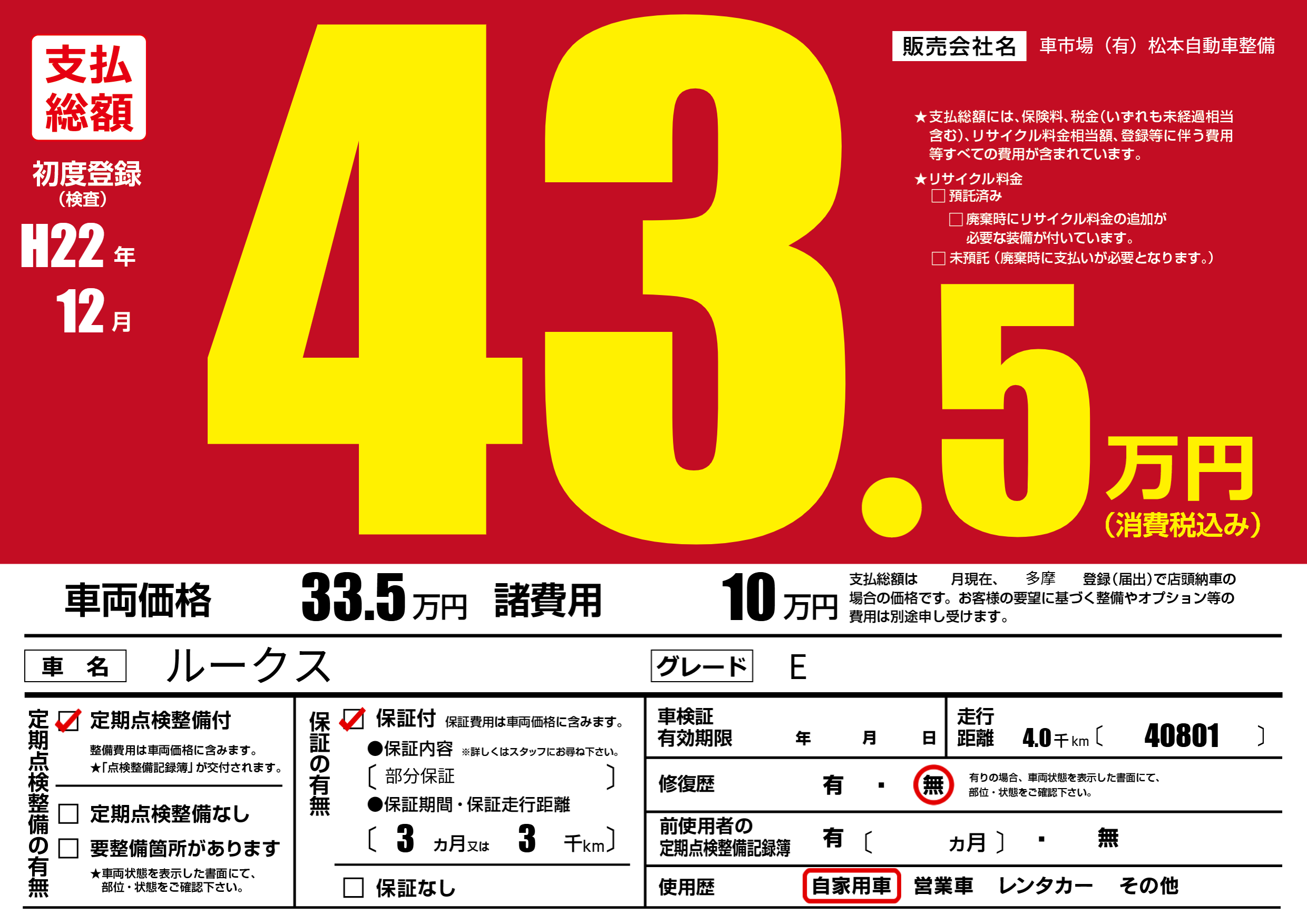 | 走行キロ | 0.4万km | 初年度登録 | H22年12月 |