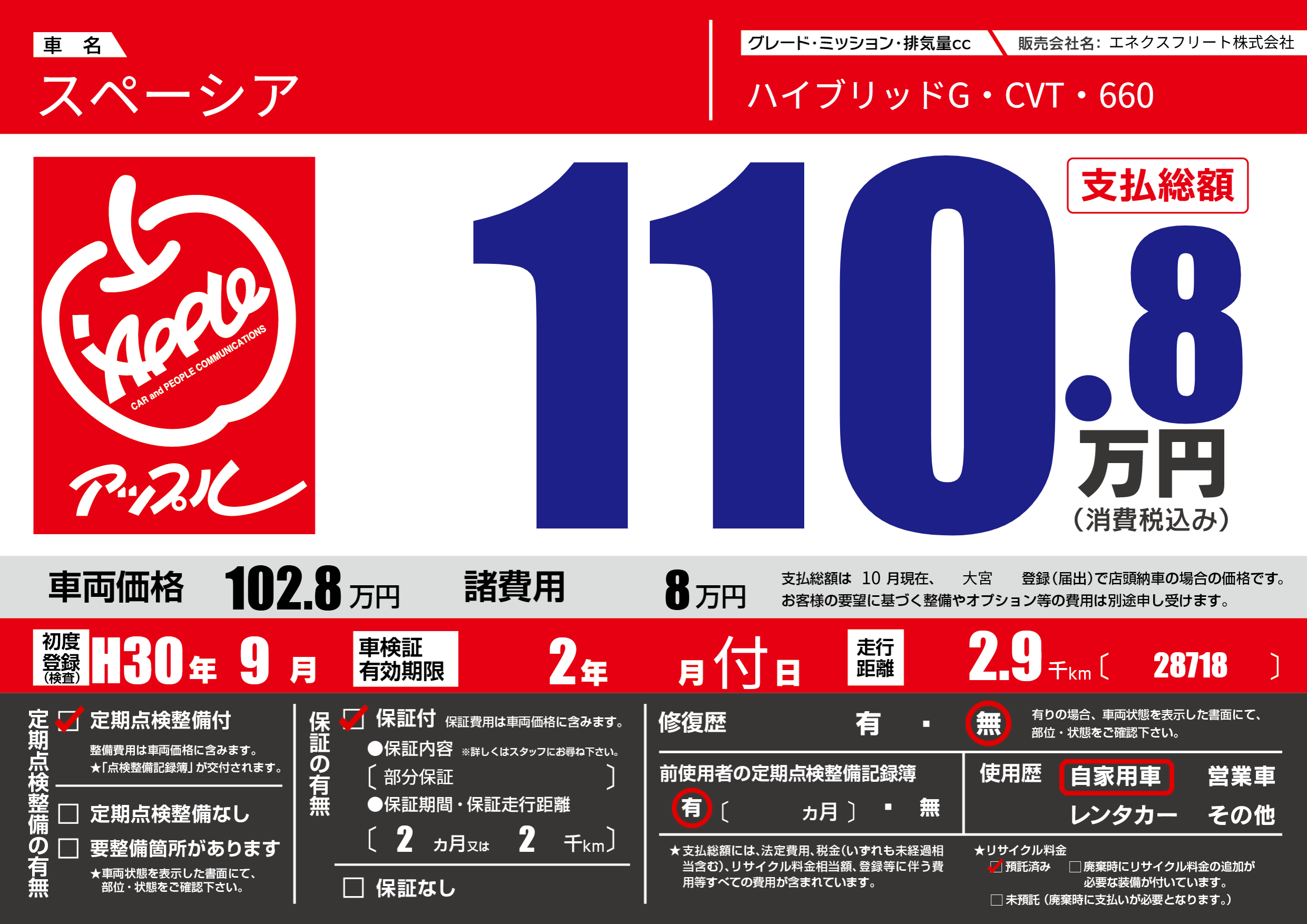 | 走行キロ | 0.2万km | 初年度登録 | H30年9月 |