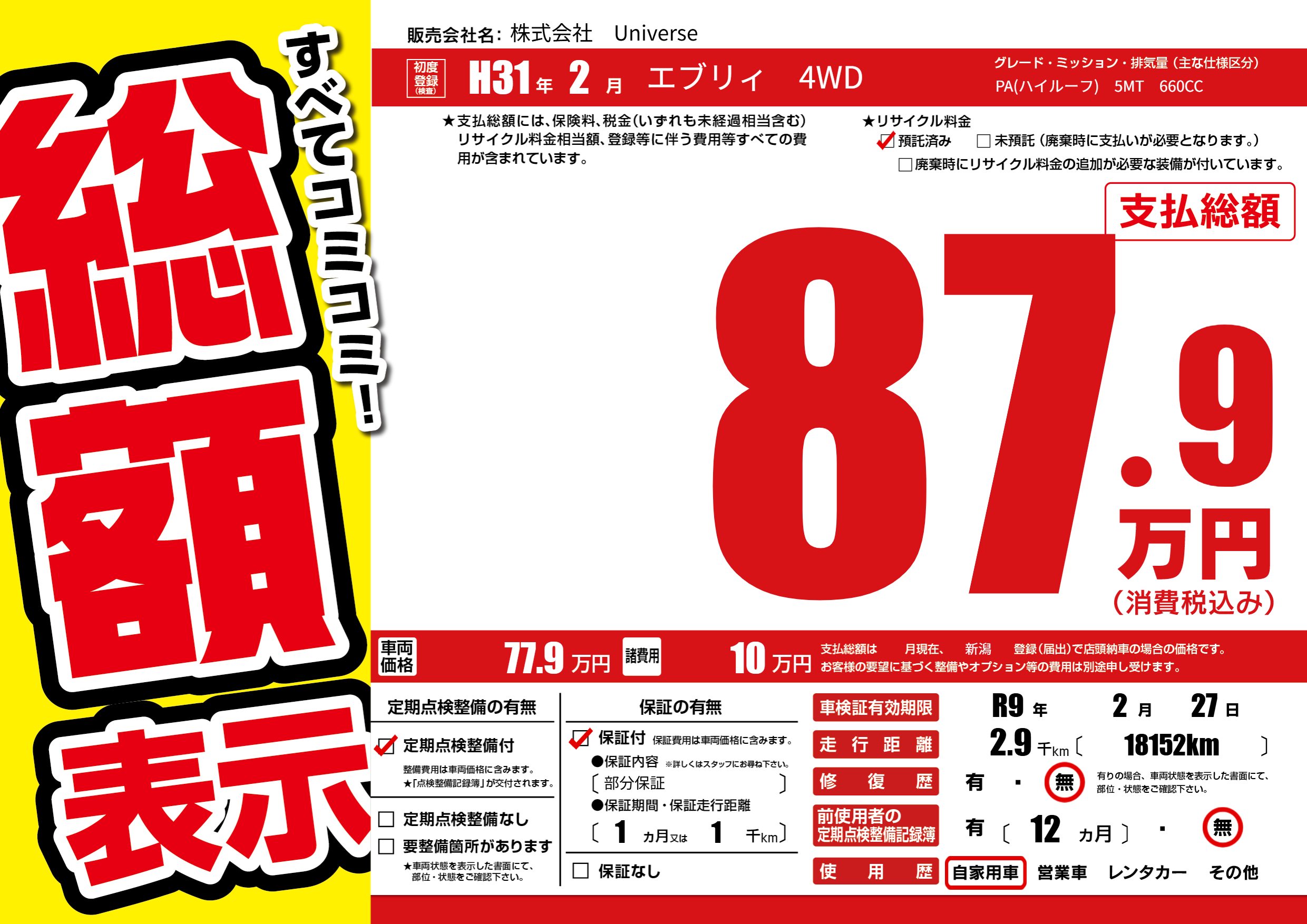 | 車名 | エブリィ 4WD | グレード ミッション 排気量 |