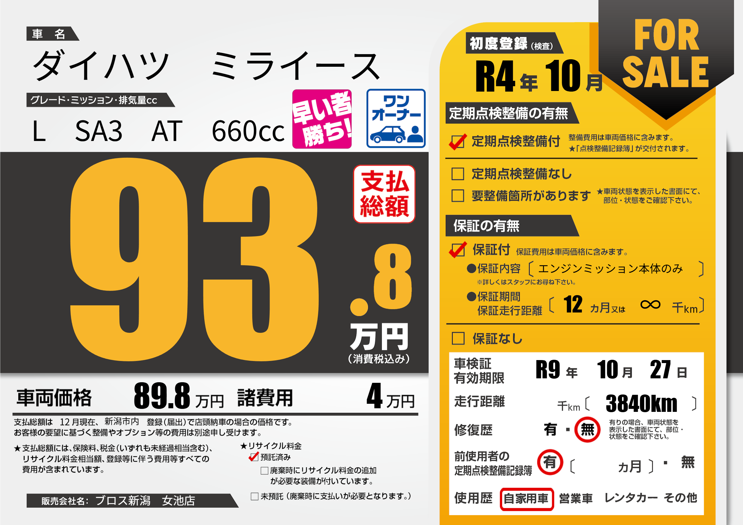 | 車名 | ダイハツ ミライース | グレード ミッション 排気量 |