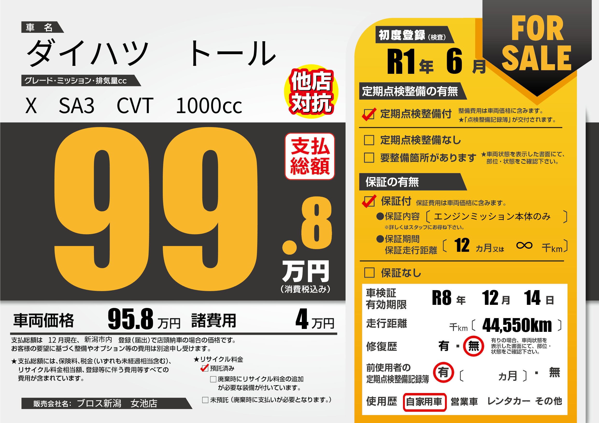 | 車名 | ダイハツ トール | グレード ミッション 排気量 |