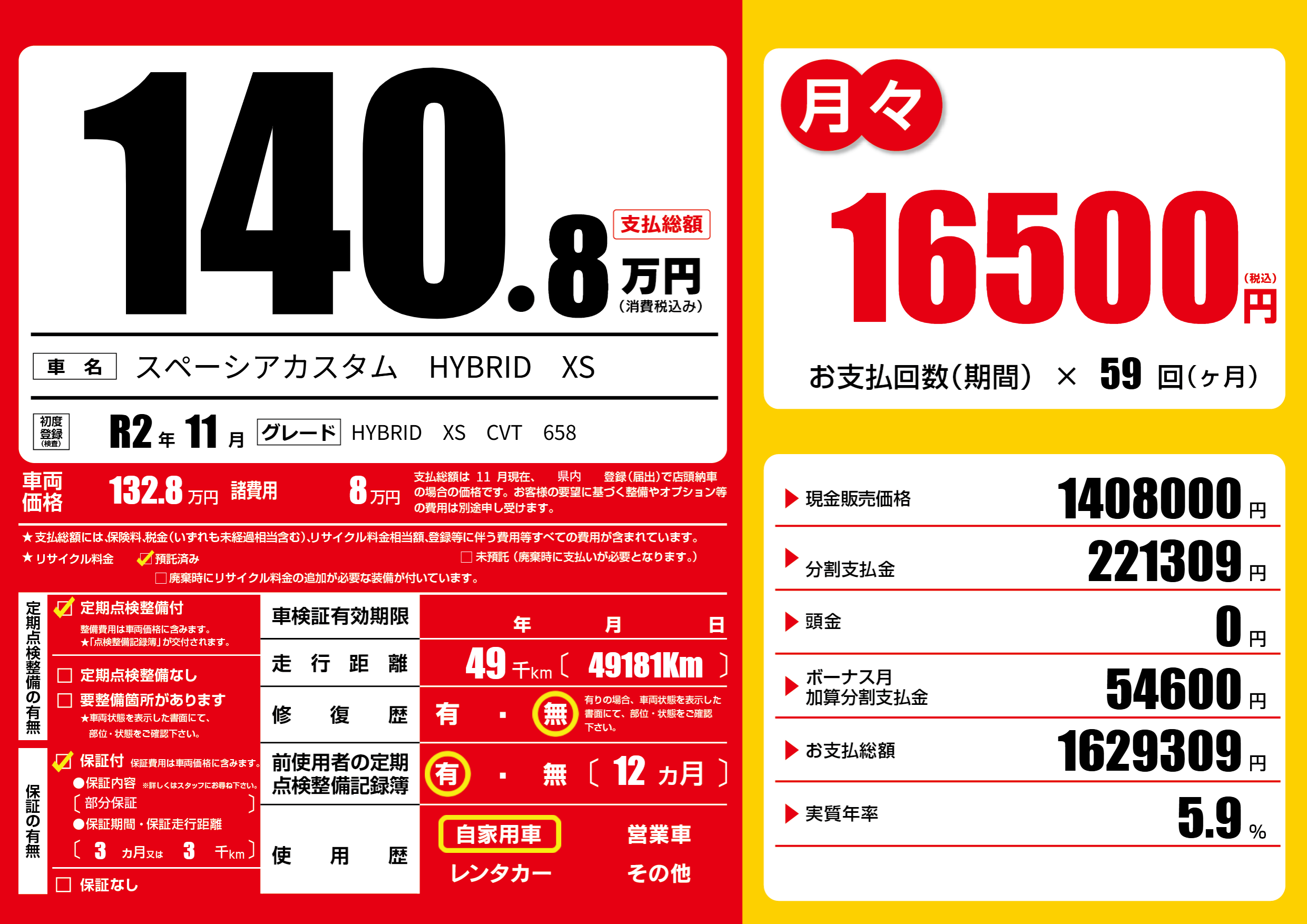 | 走行キロ | 4.9万km | 初年度登録 | R2年11月 |