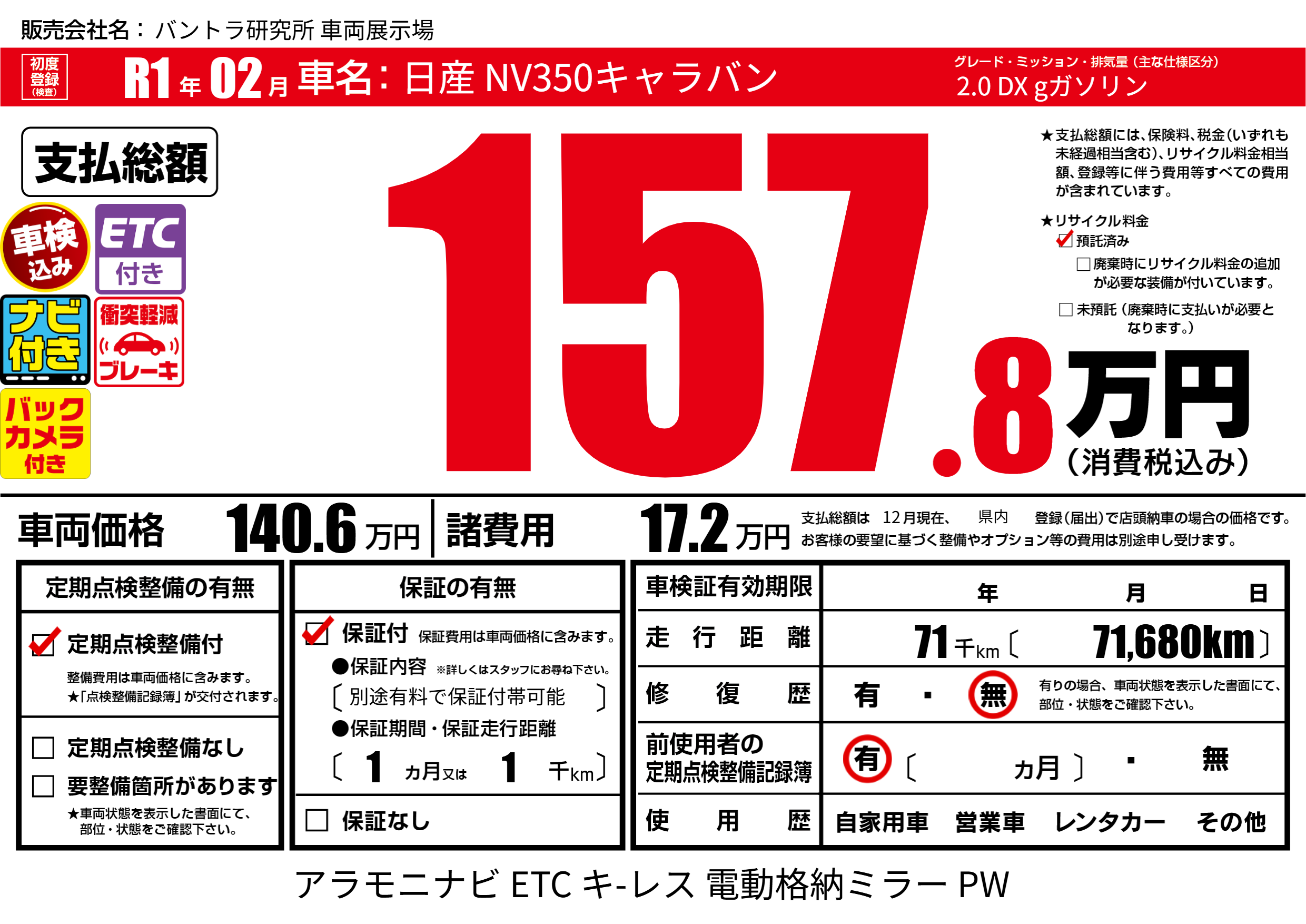 | 走行キロ | 7.1万km | 初年度登録 | R1年02月 |