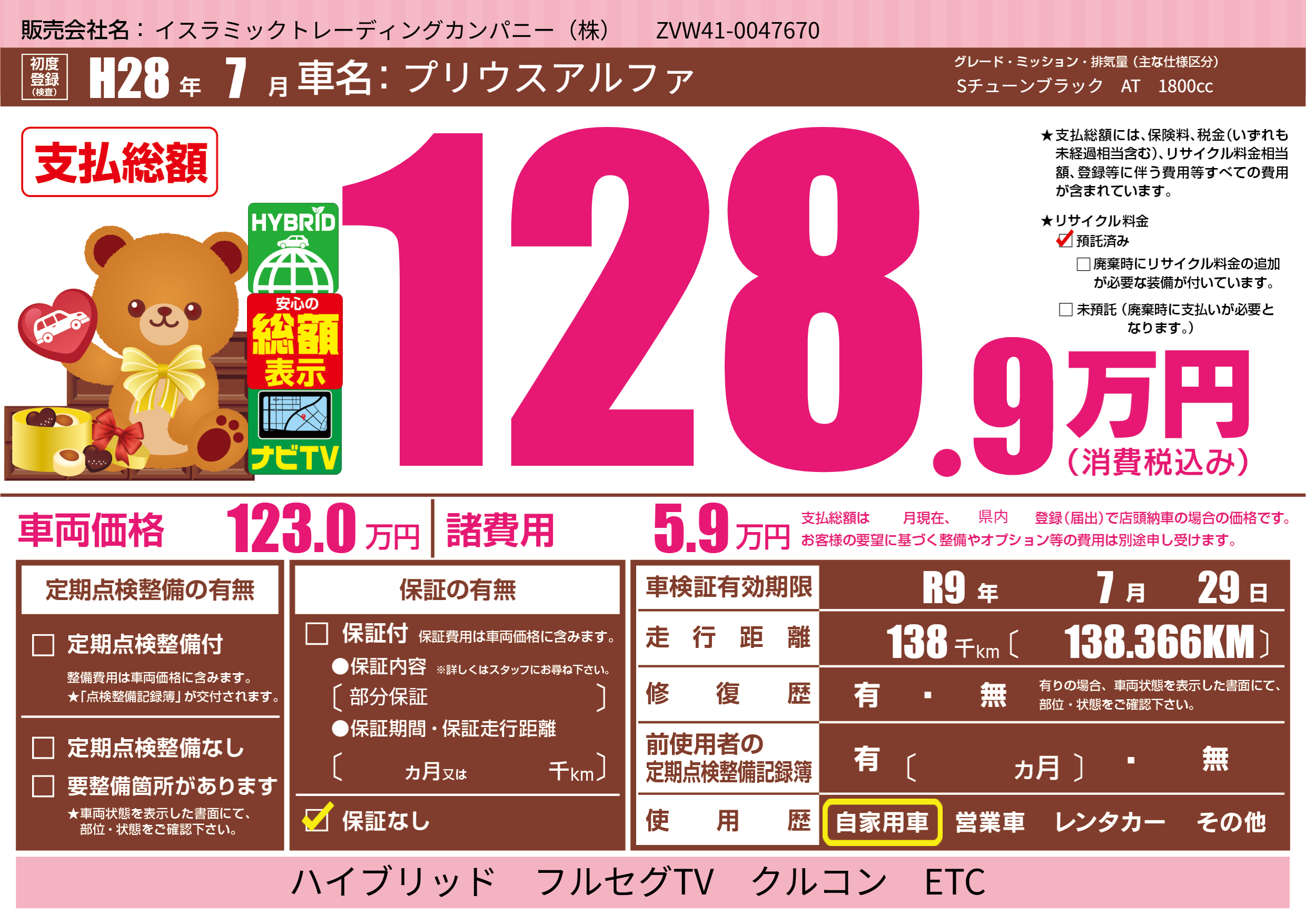 | 走行キロ | 13.8万km | 初年度登録 | H28年7月 |