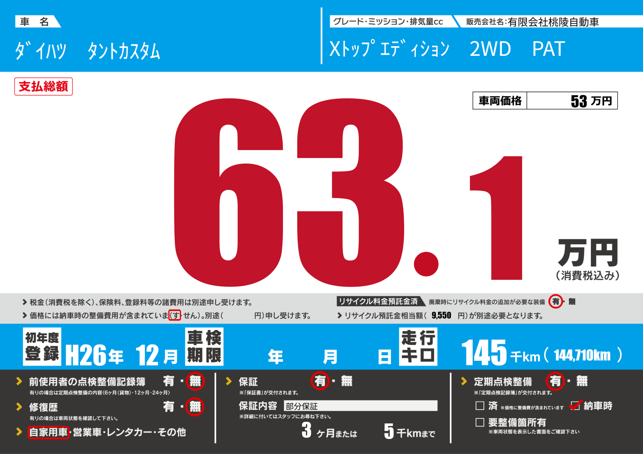 保証付き 保証内容(部分保証) 3ヶ月または(5)千kmまで |