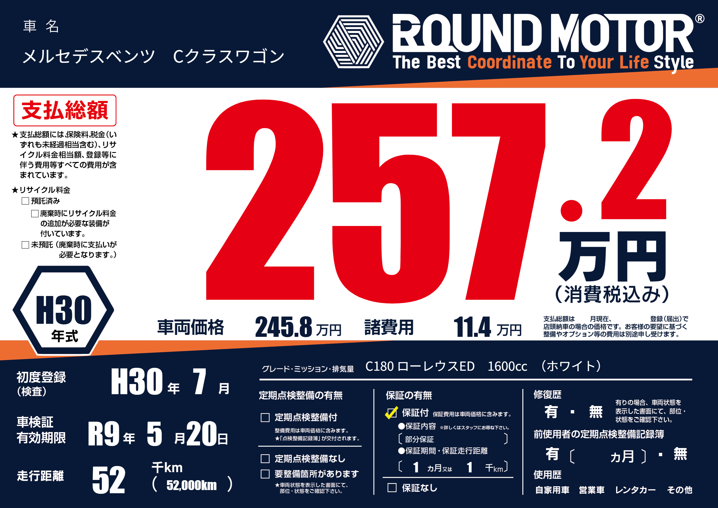 | 車名 | メルセデスベンツ Cクラスワゴン | グレード ミッション 排気量 |