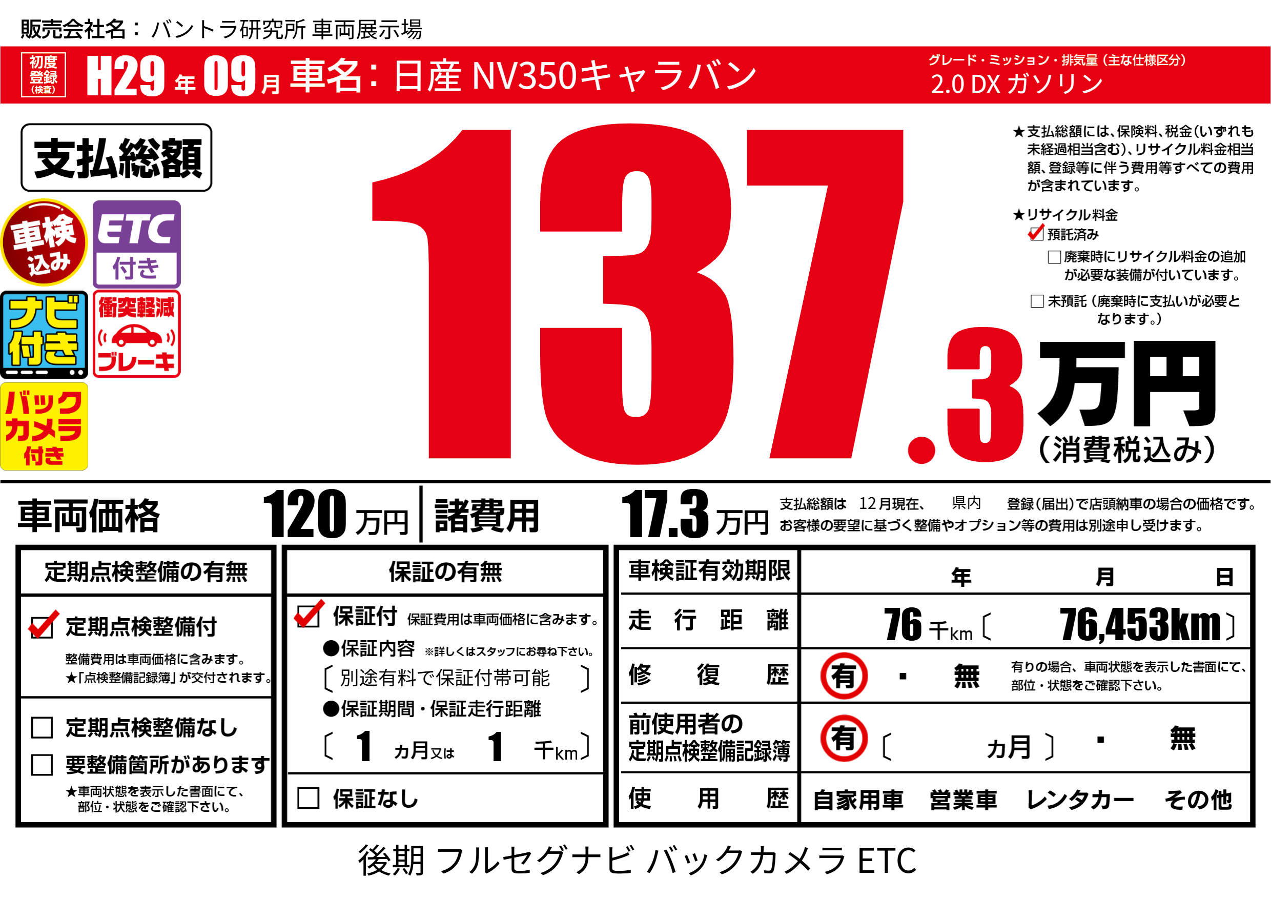 | 車名 | 日産 NV350キャラバン | グレード ミッション 排気量 |