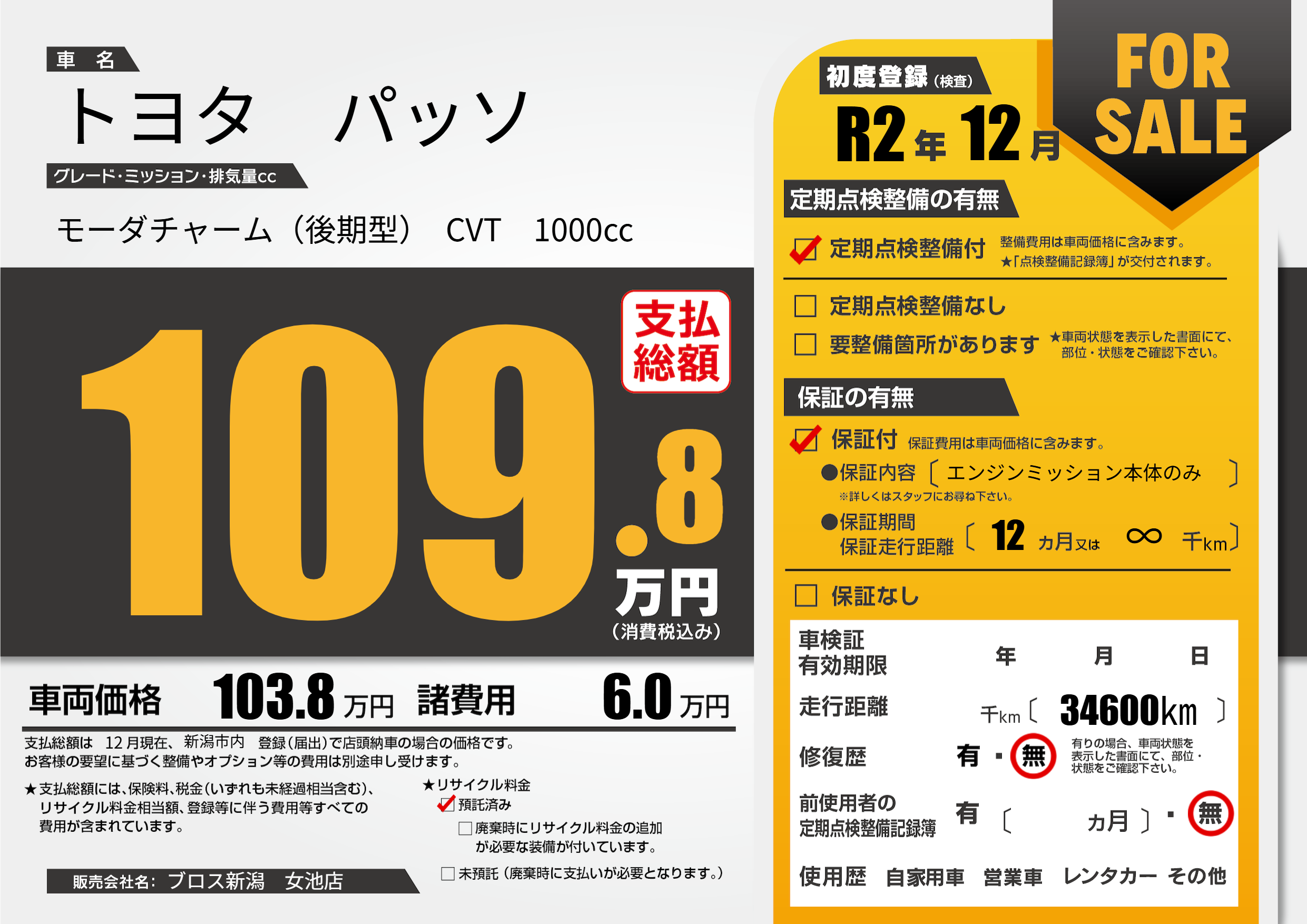 | 車名 | トヨタ パッソ | グレード ミッション 排気量 |