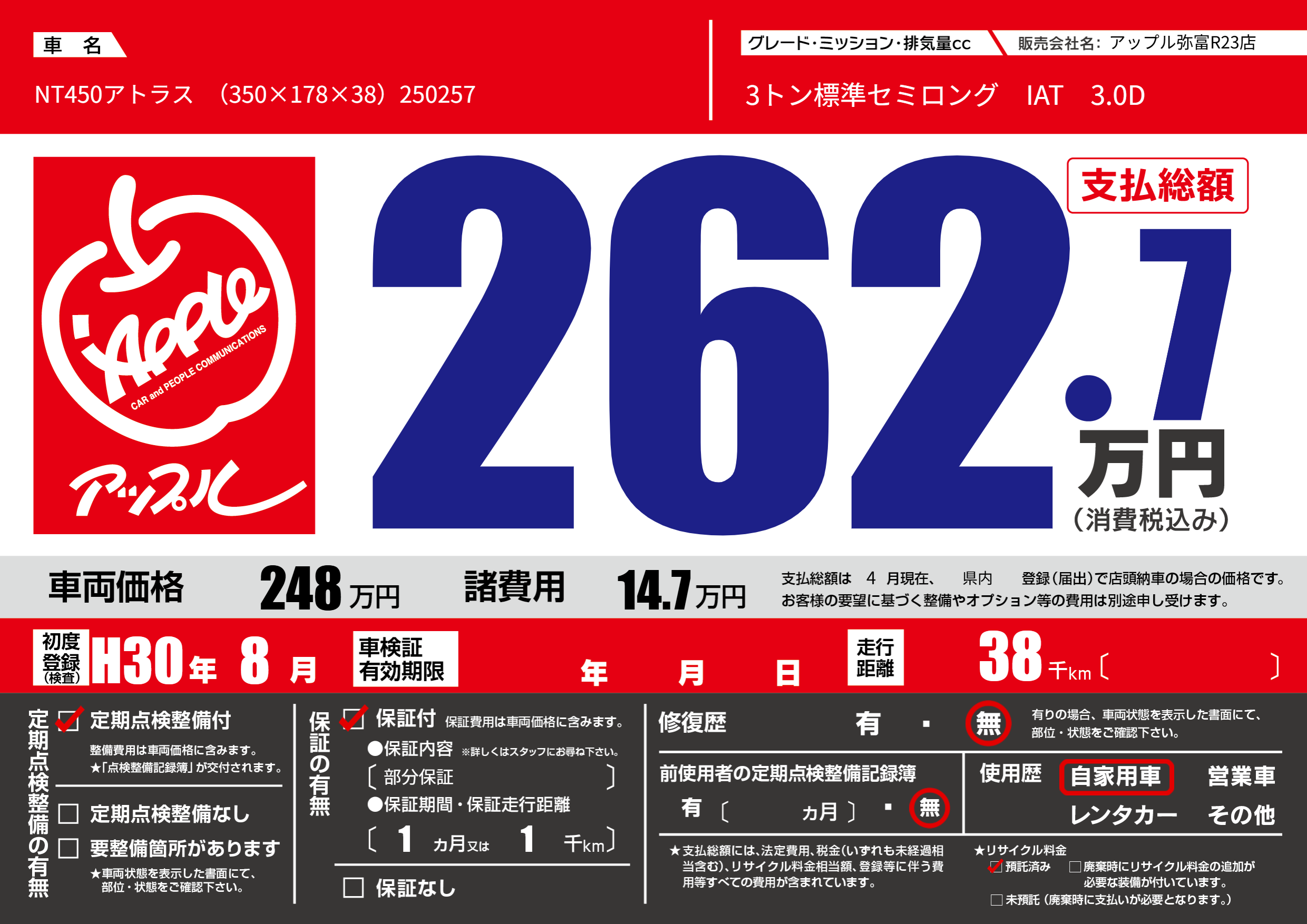 | 車名 | NT450アトラス (350×178×38)250257 | グレード ミッション 排気量 |