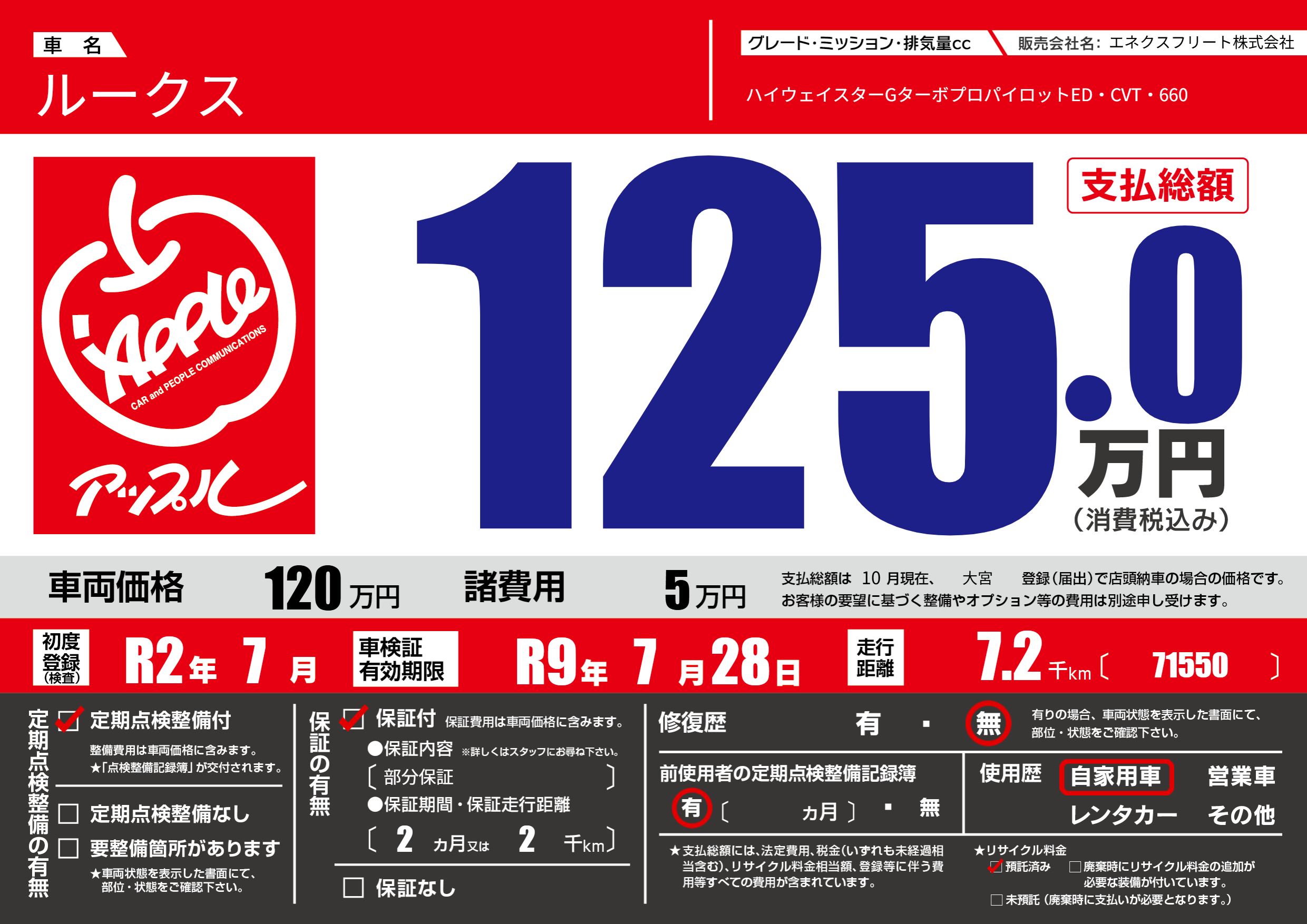 | 走行キロ | 0.7万km | 初年度登録 | R2年7月 |