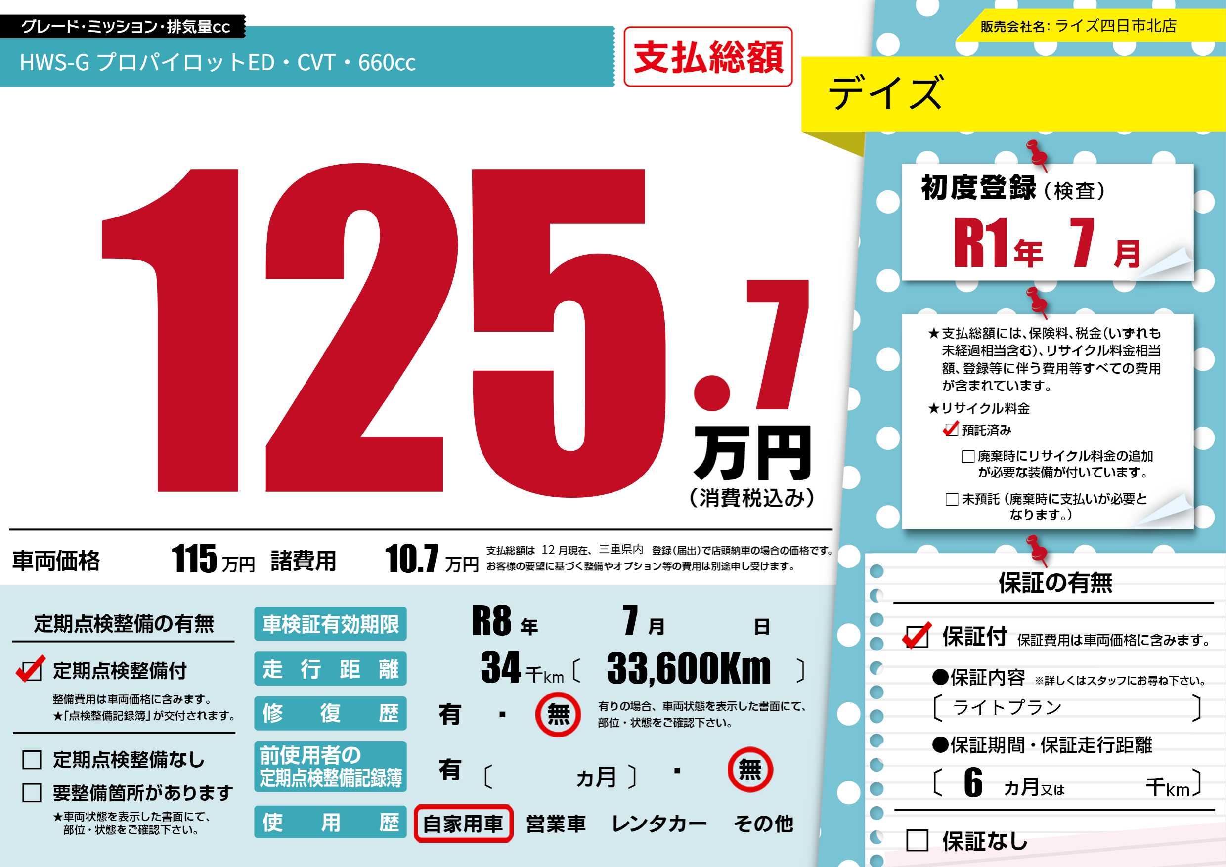 | 車名 | デイズ | グレード ミッション 排気量 |