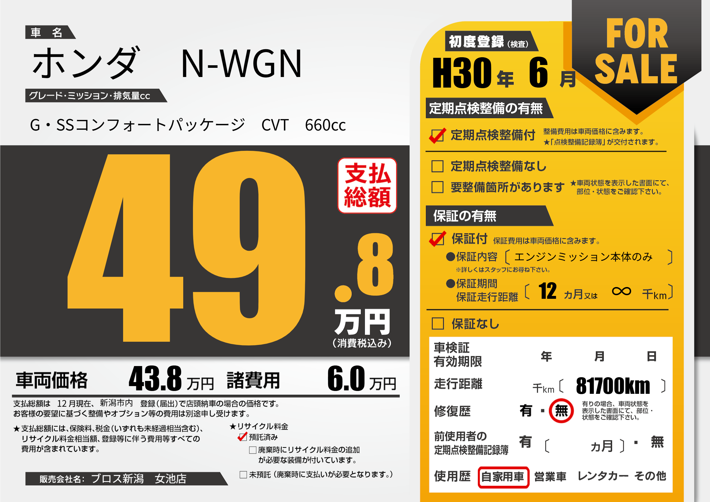 | 車名 | ホンダ N-WGN | グレード ミッション 排気量 |