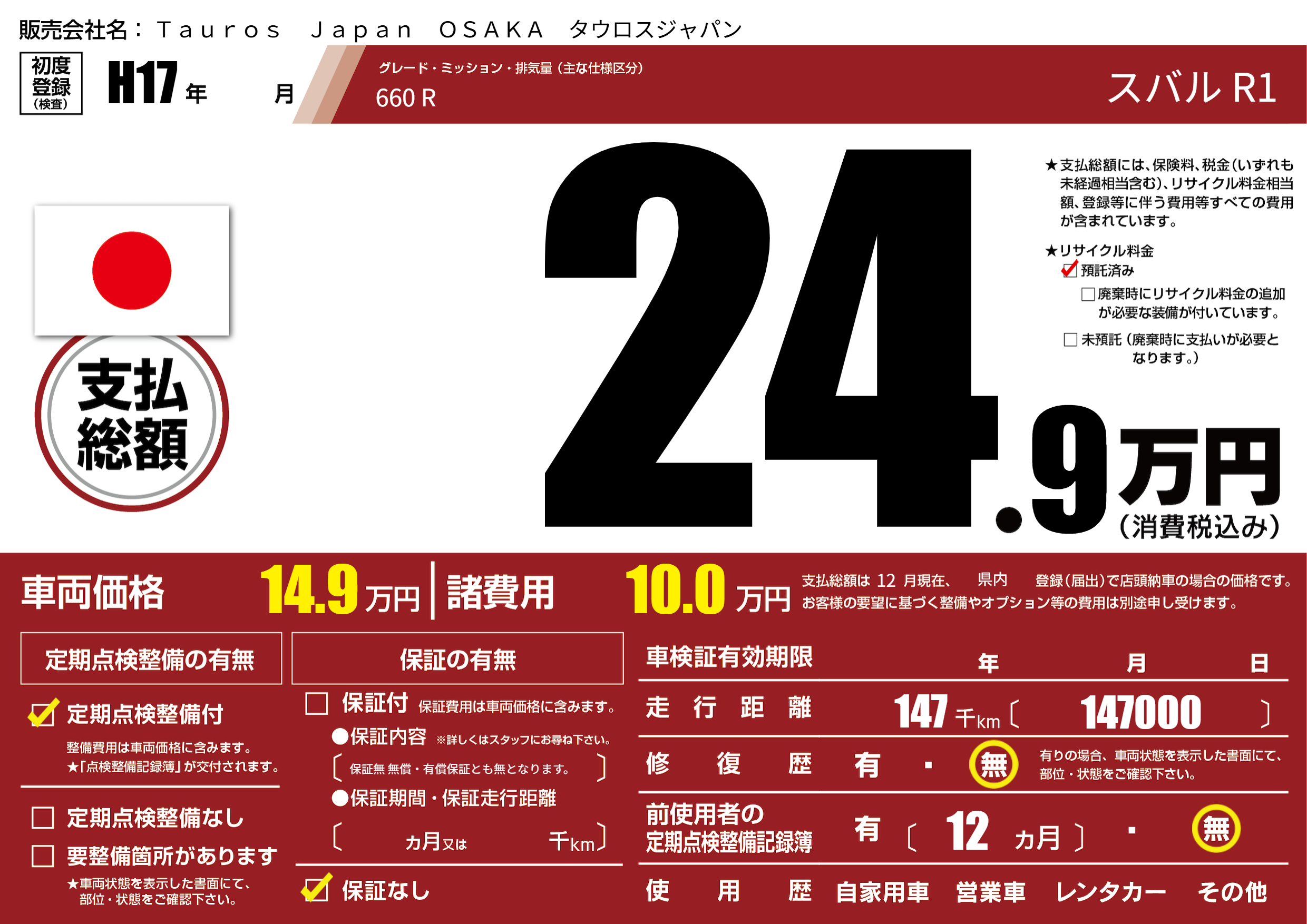 | 車名 | スバル R1 | グレード ミッション 排気量 |