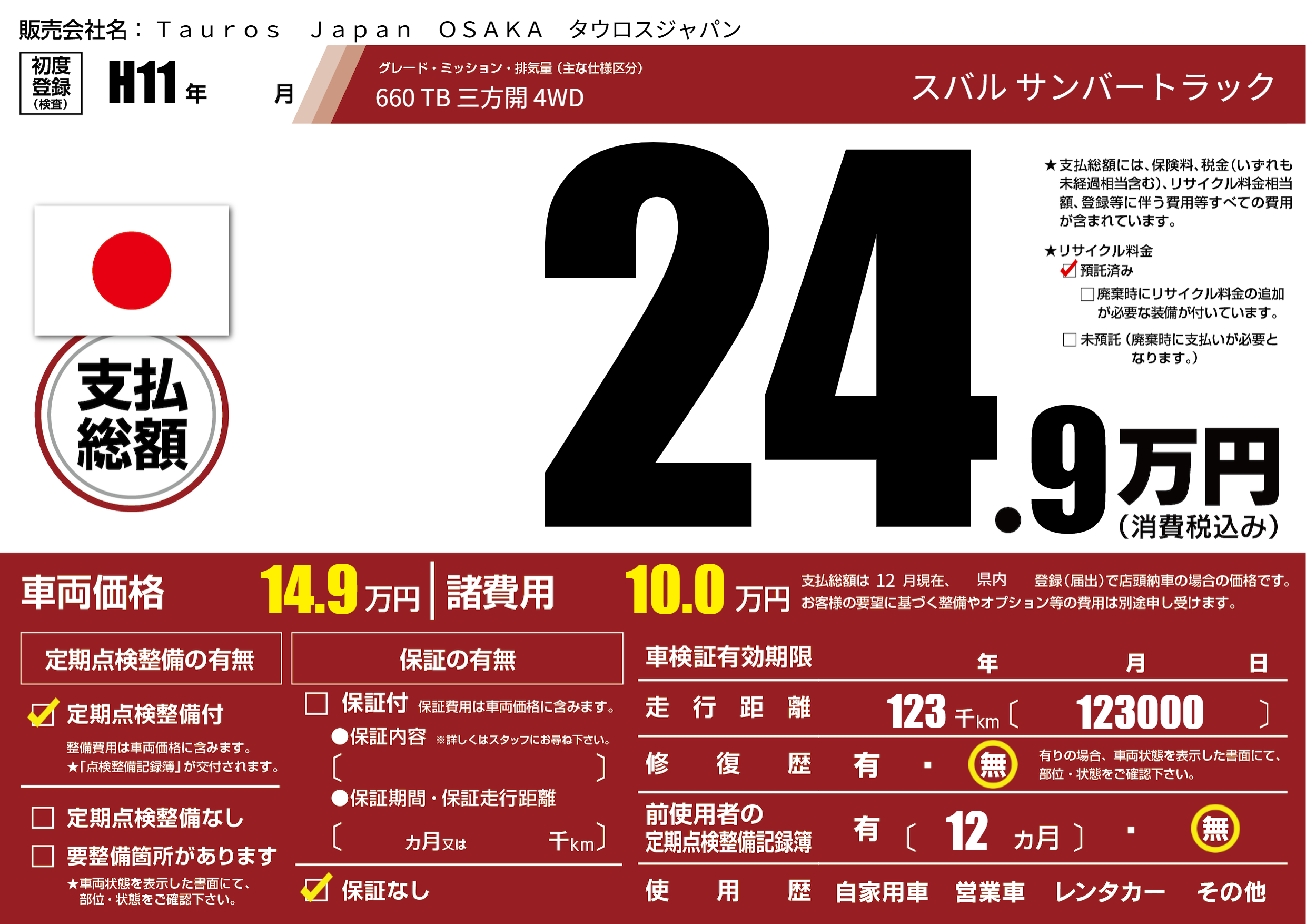 | 走行キロ | 12.3万km | 初年度登録 | H11年---月 |