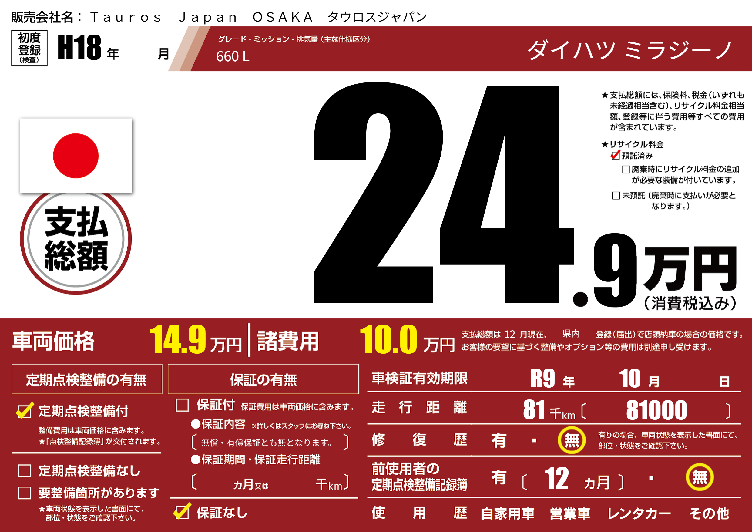 あり | リサイクル預託金相当額 | ( 0円)が別途必要 |