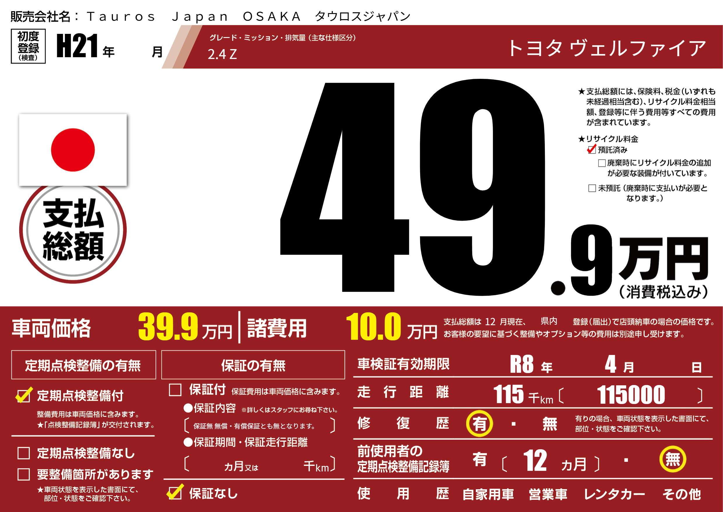 あり | リサイクル預託金相当額 | ( 0円)が別途必要 |
