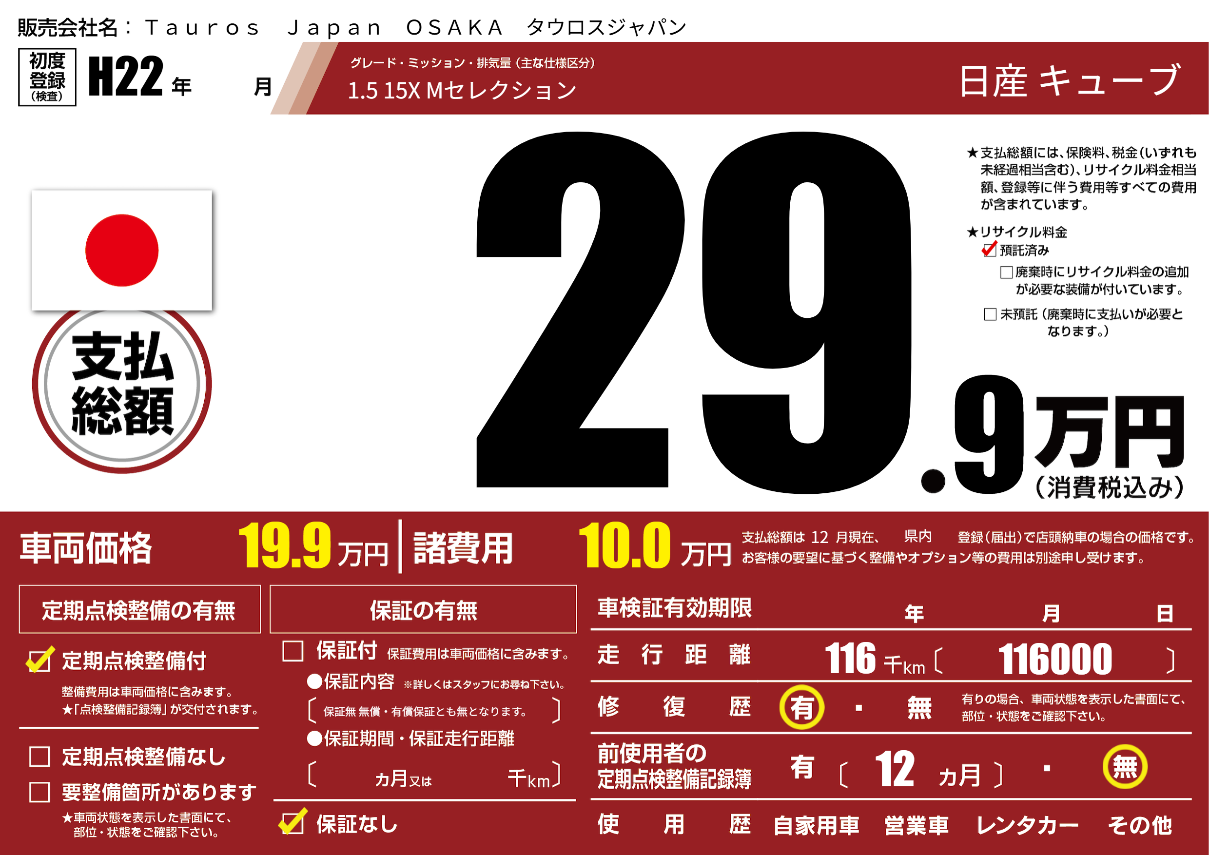 | 車名 | 日産 キューブ | グレード ミッション 排気量 |