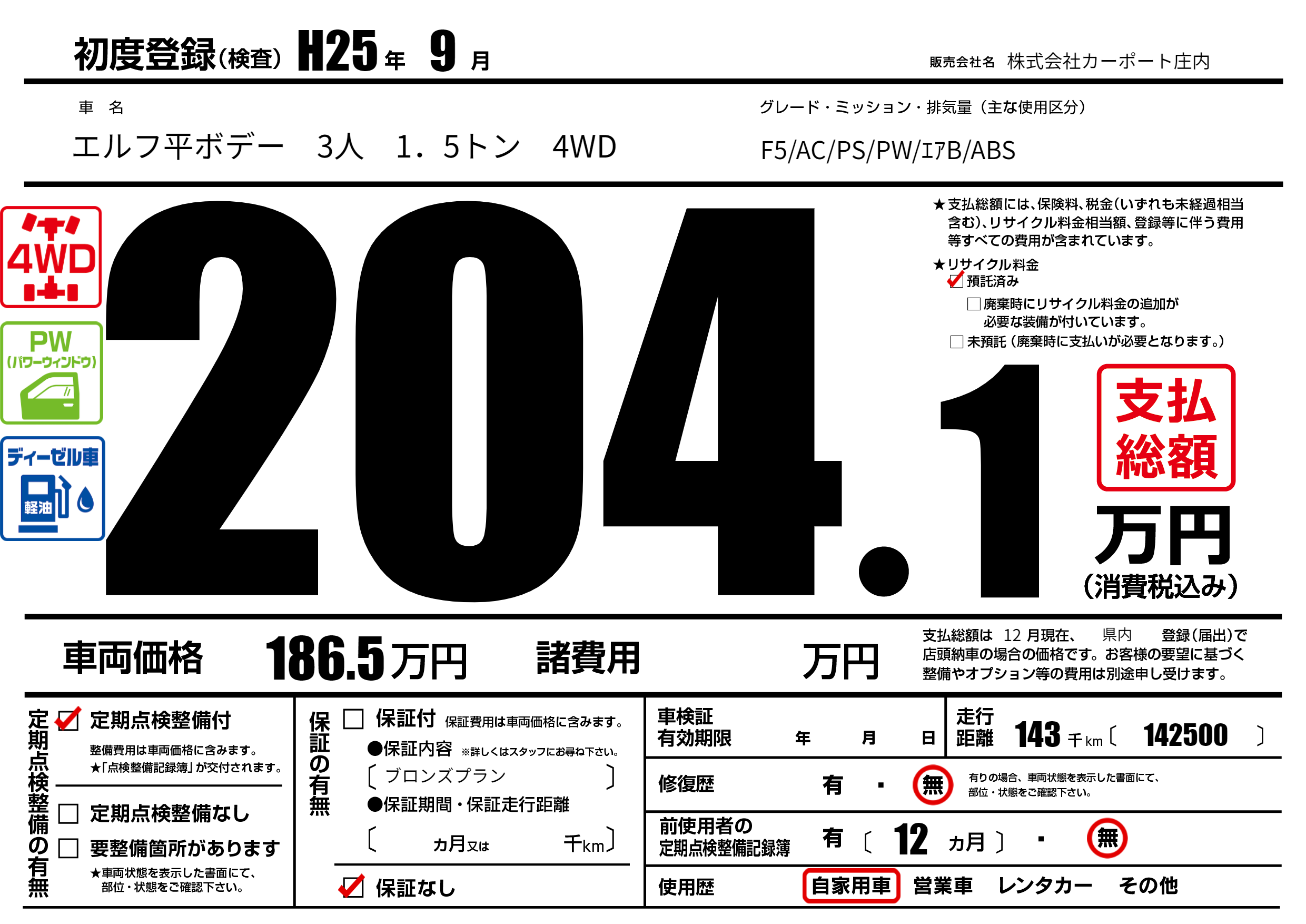 | 車名 | エルフ平ボデー 3人 1.5トン 4WD | グレード ミッション 排気量 |