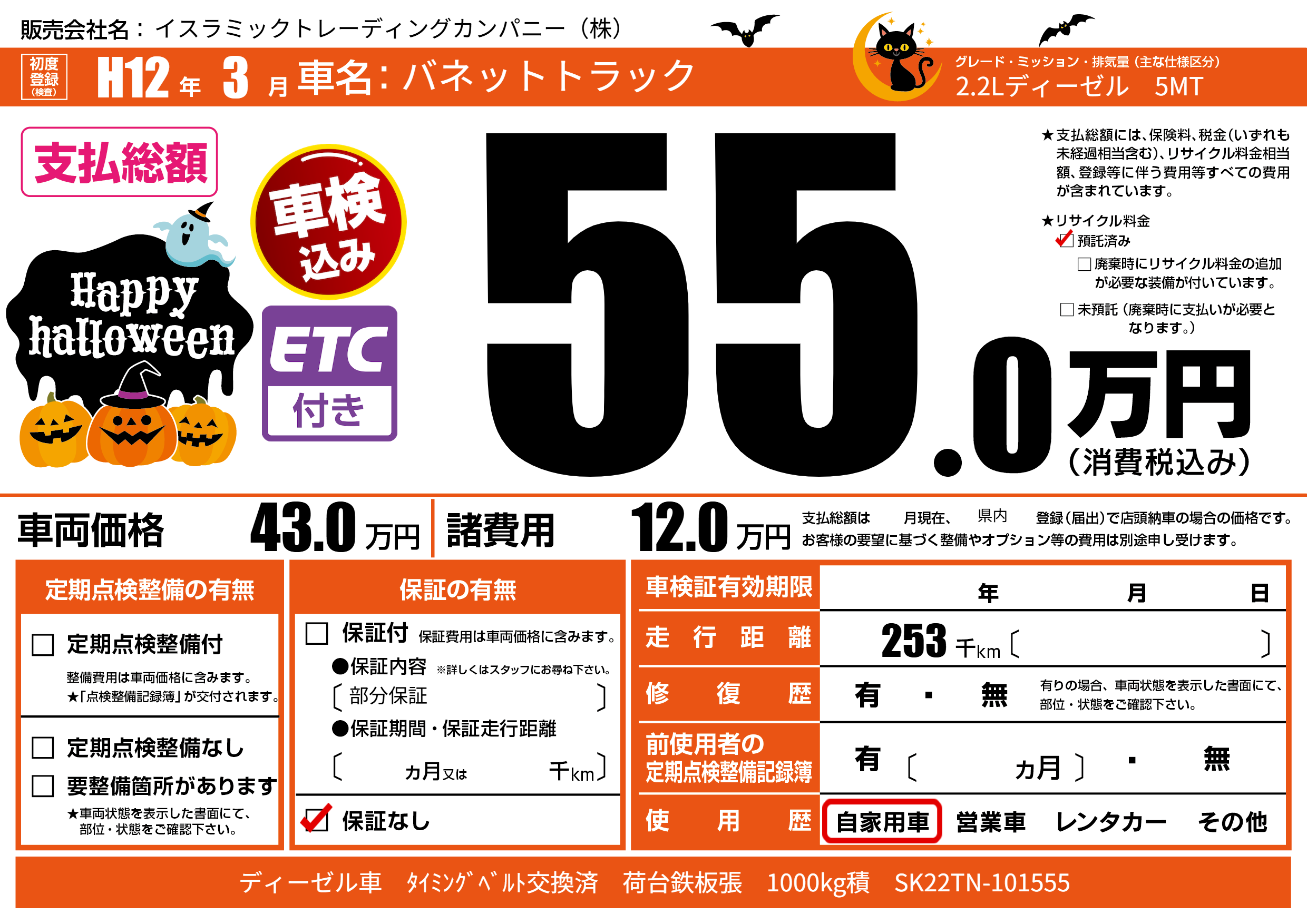 | 走行キロ | 25.3万km | 初年度登録 | H12年3月 |