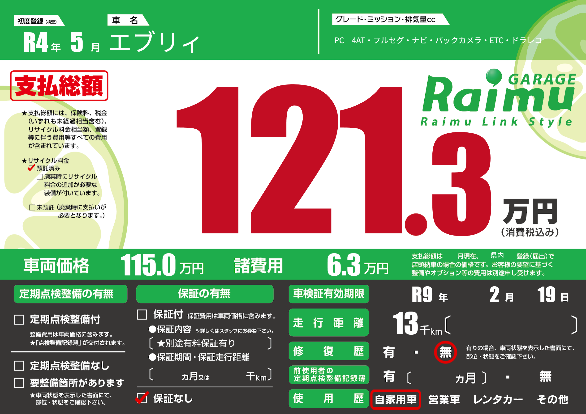 保証なし 保証内容(★別途有料保証有り) ---ヶ月または()千kmまで |