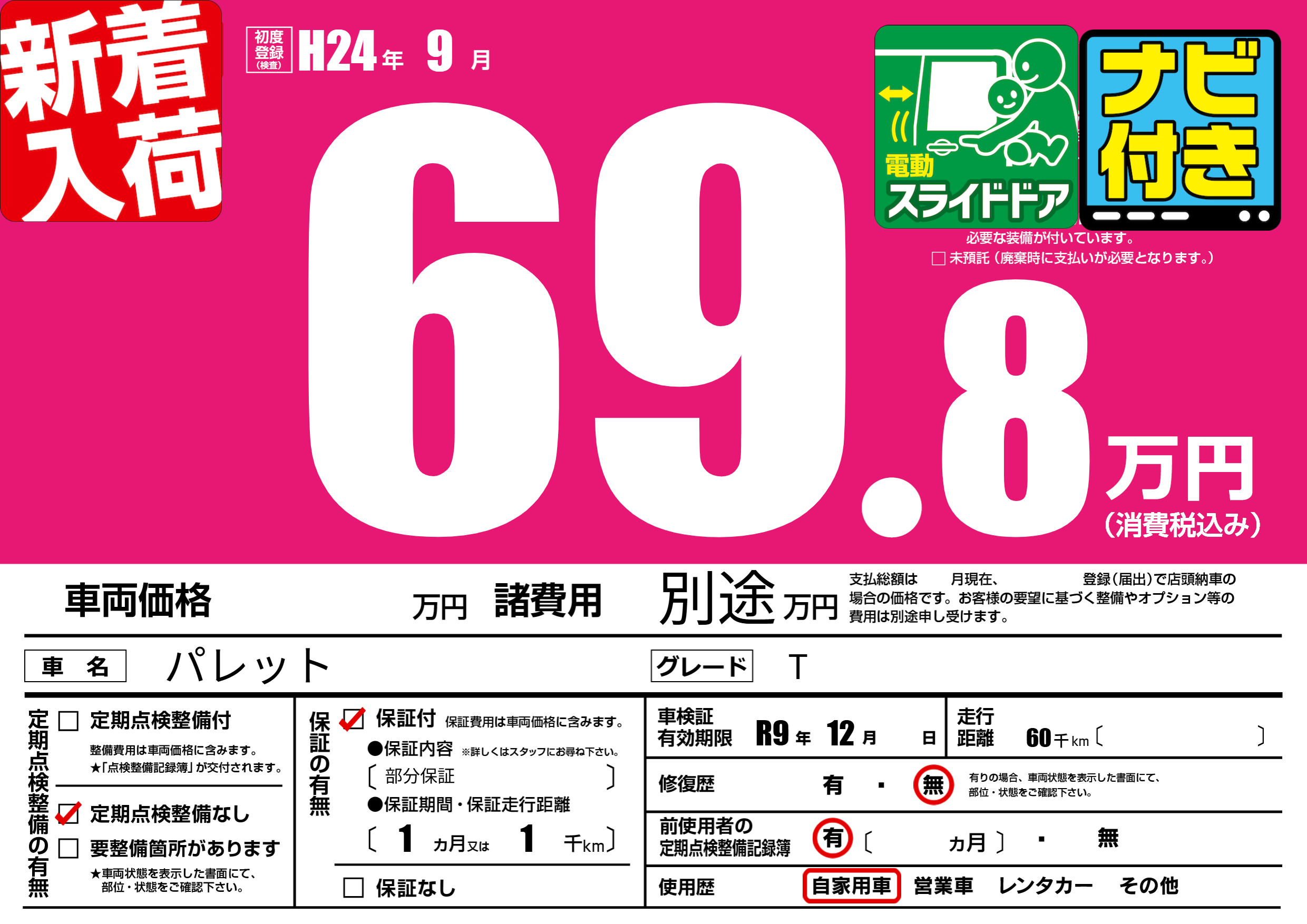 | 走行キロ | 6万km | 初年度登録 | H24年9月 |