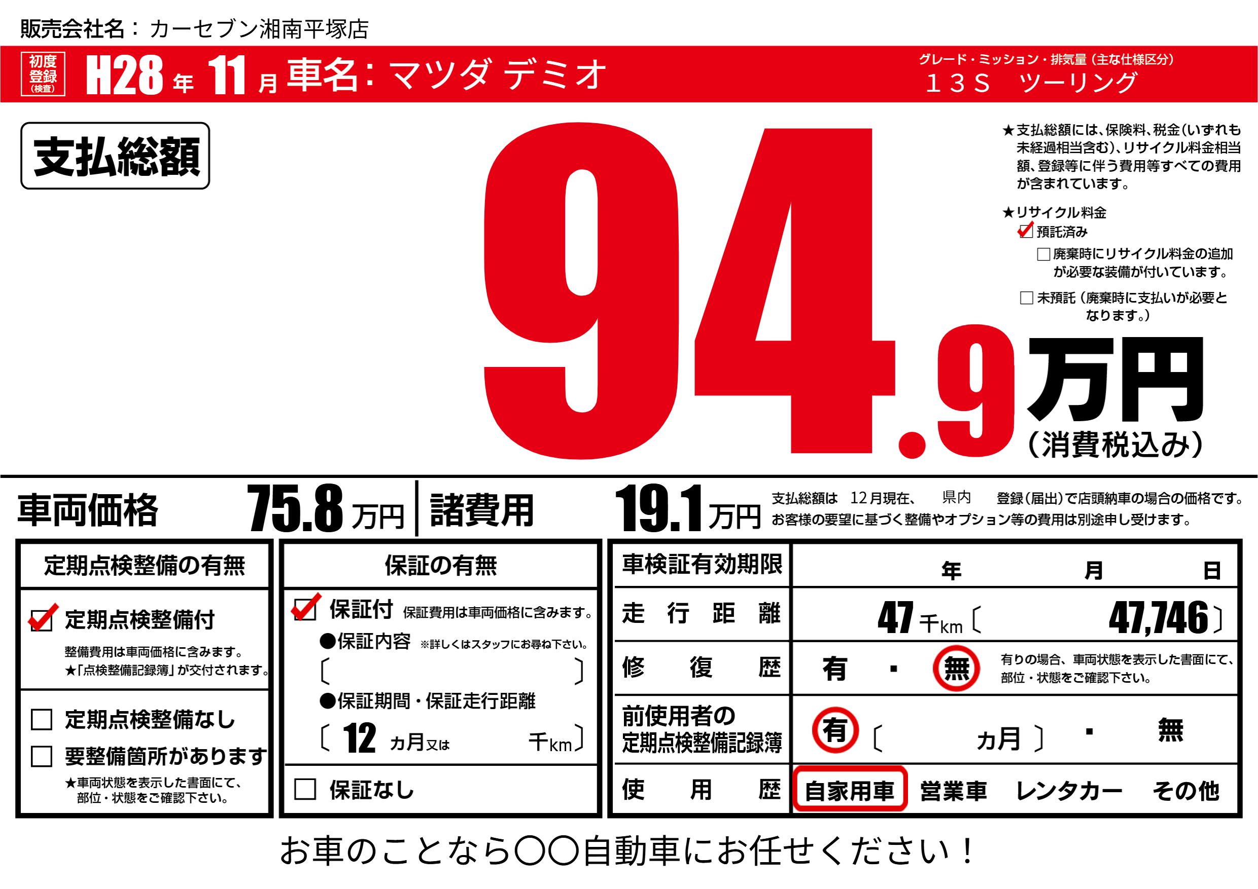 | 車名 | マツダ デミオ | グレード ミッション 排気量 |