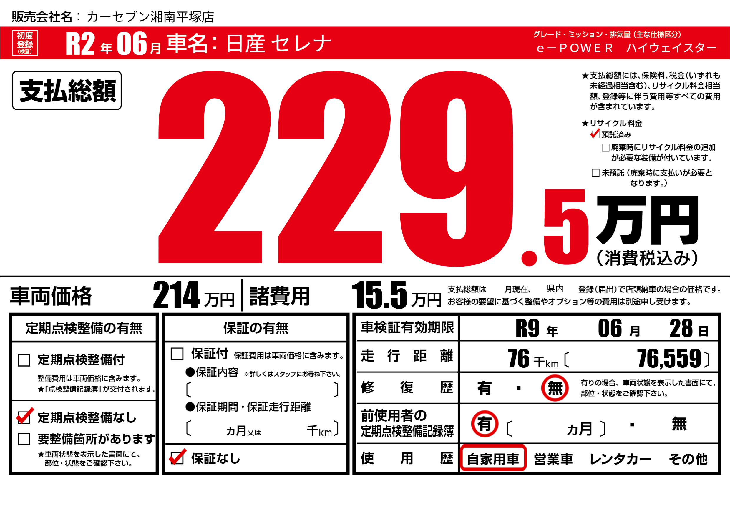 | 車名 | 日産 セレナ | グレード ミッション 排気量 |