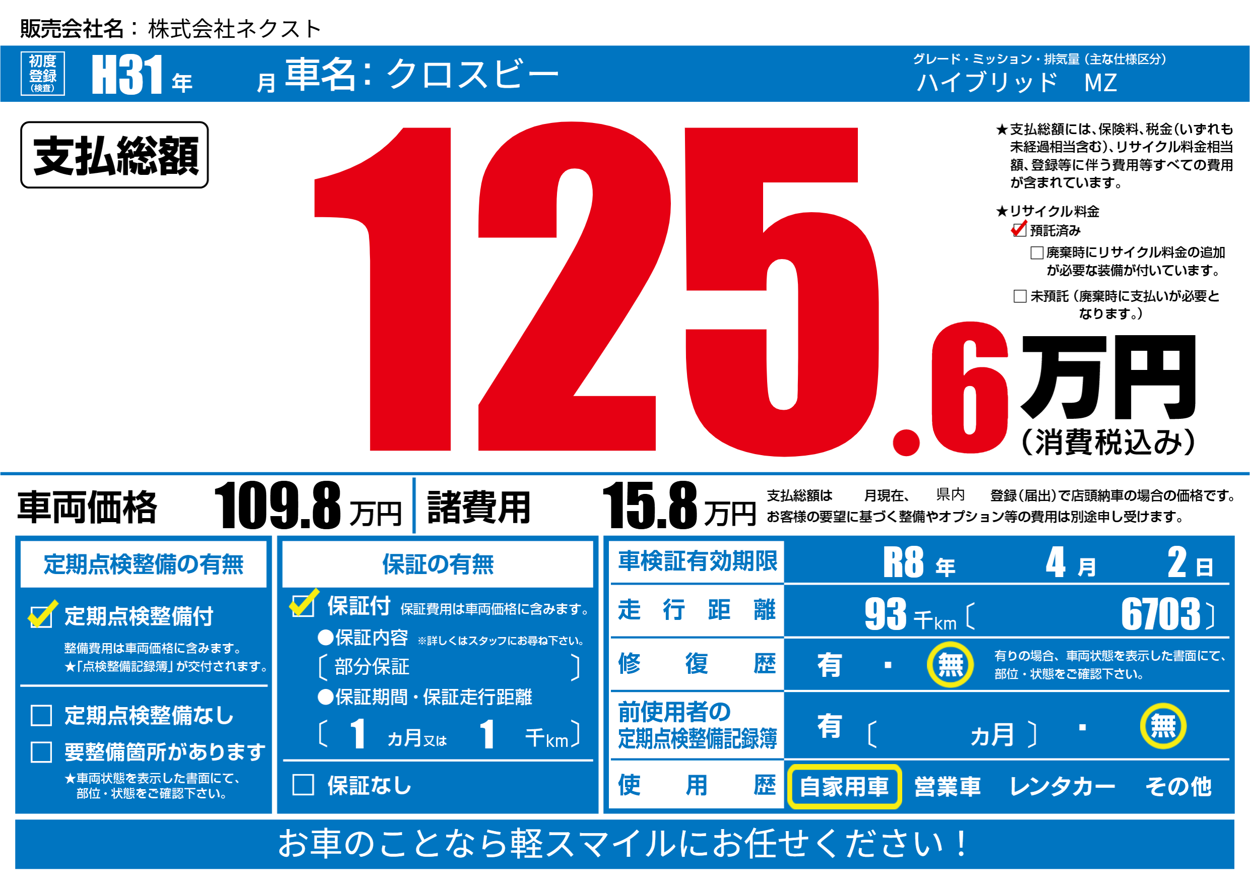 | 車名 | クロスビー | グレード ミッション 排気量 |
