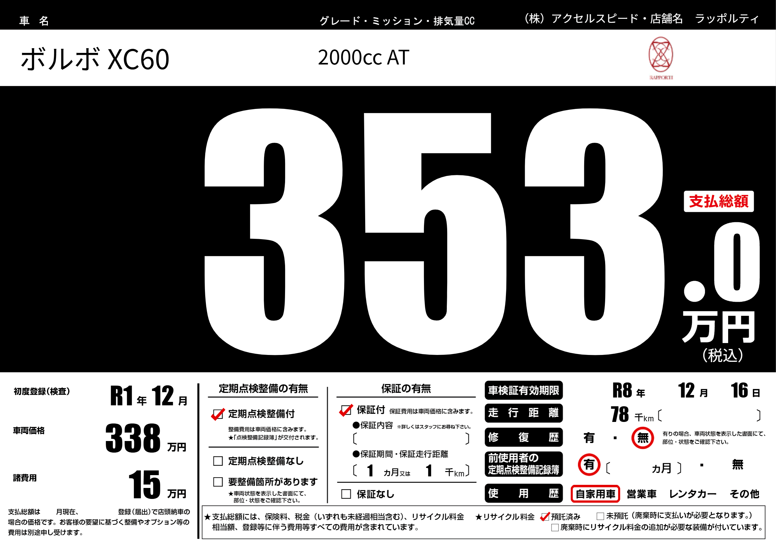 | 車名 | ボルボ XC60 | グレード ミッション 排気量 |