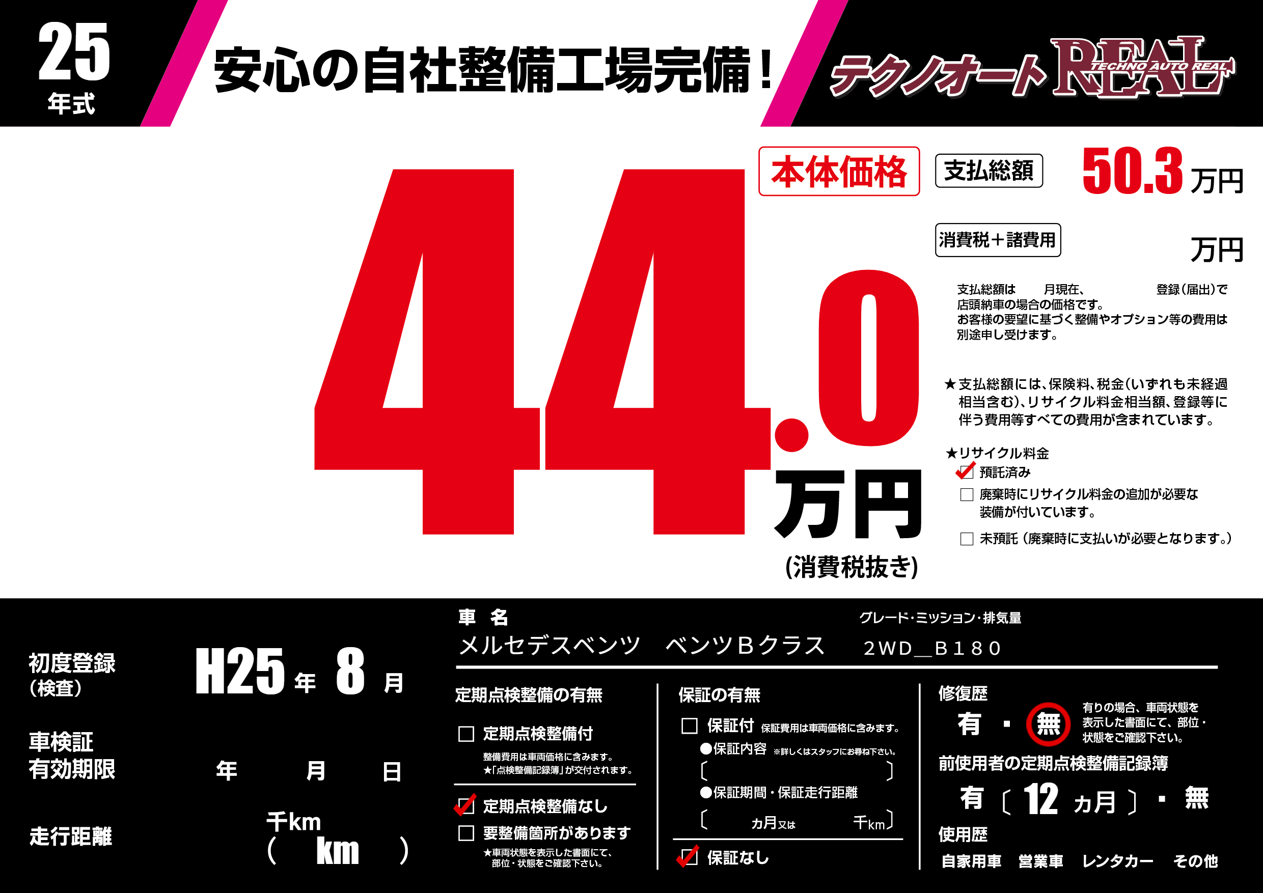| 車名 | メルセデスベンツ ベンツBクラス | グレード ミッション 排気量 |