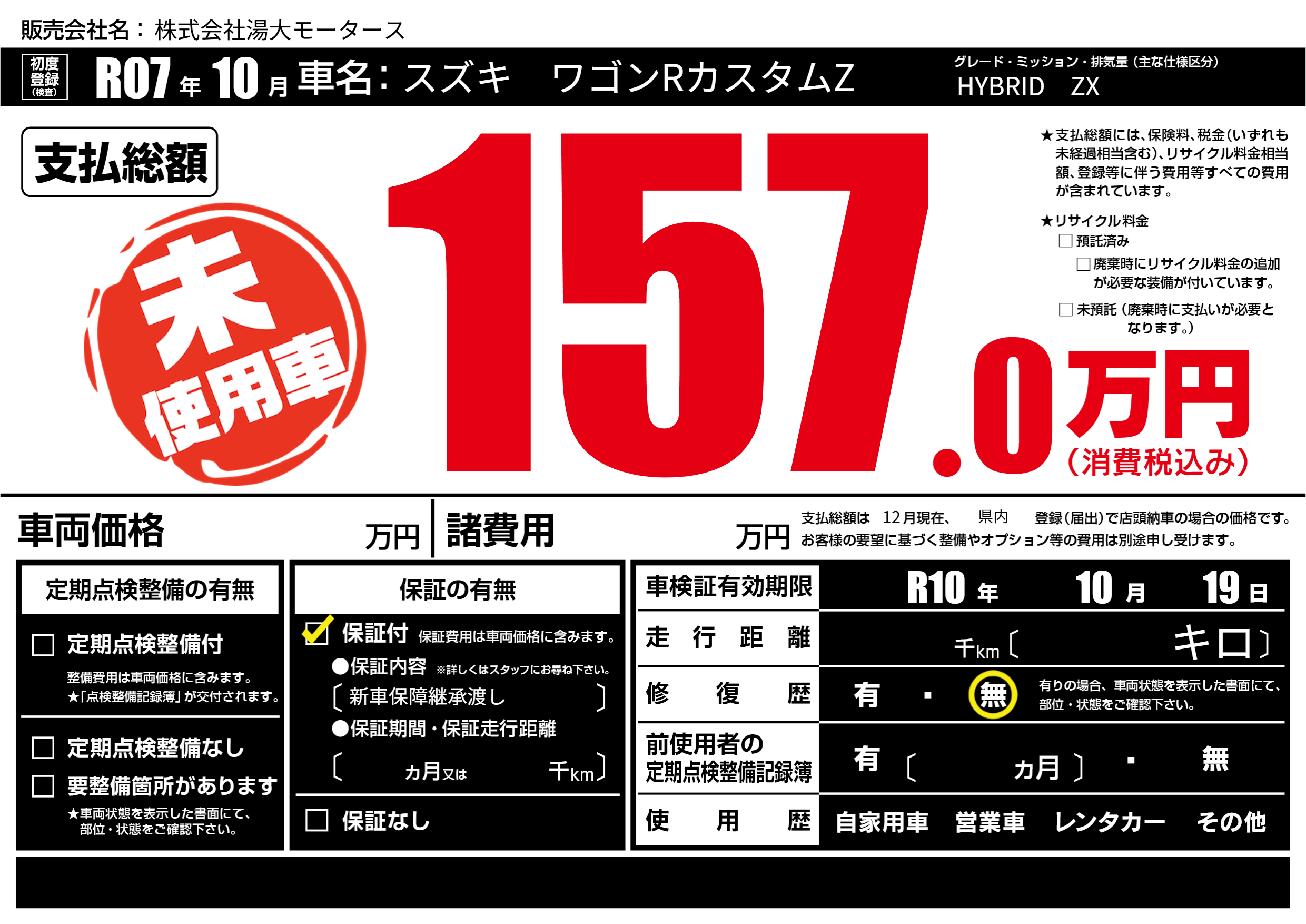| 走行キロ | - | 初年度登録 | R07年10月 |
