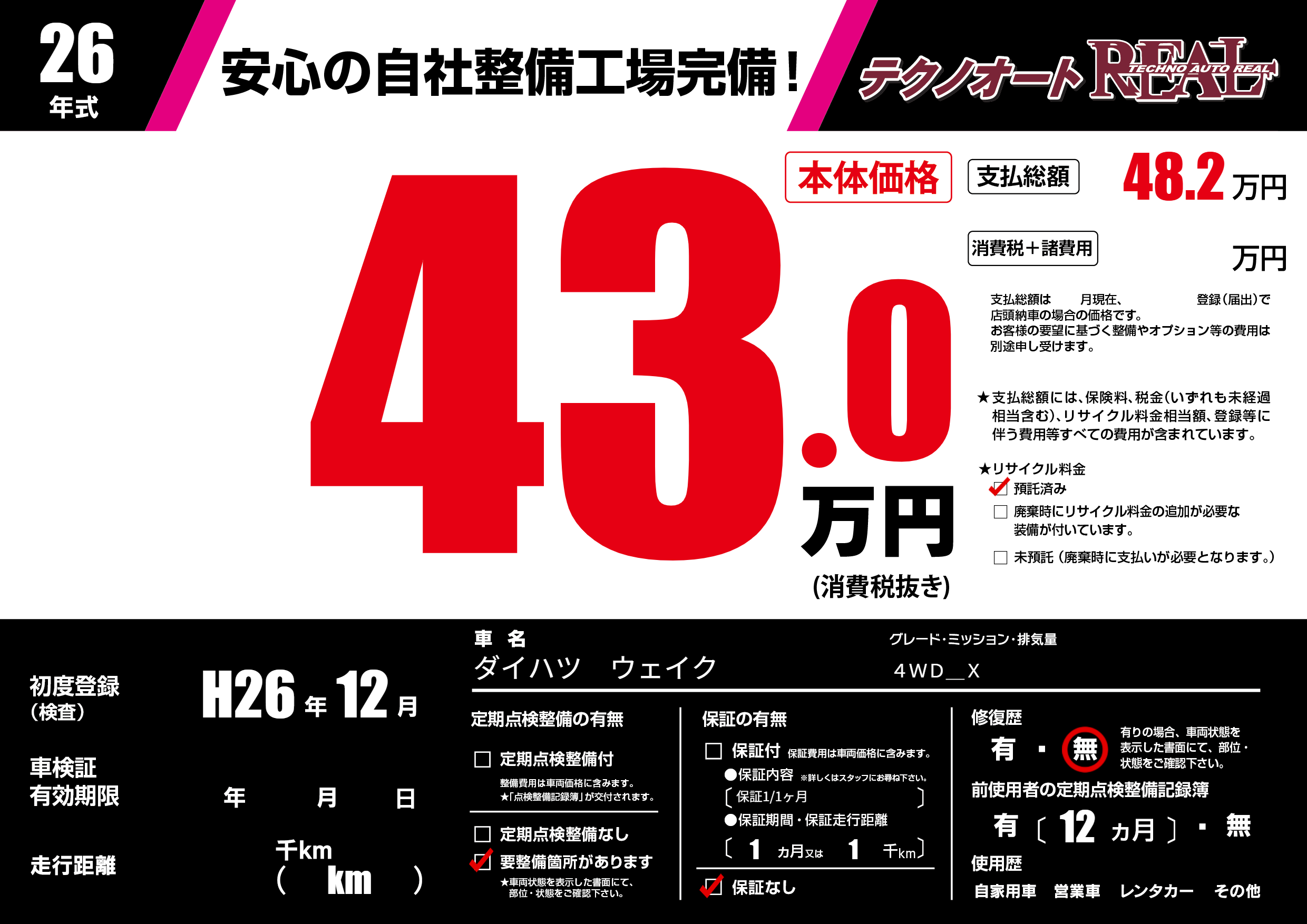 | 走行キロ | - | 初年度登録 | H26年12月 |