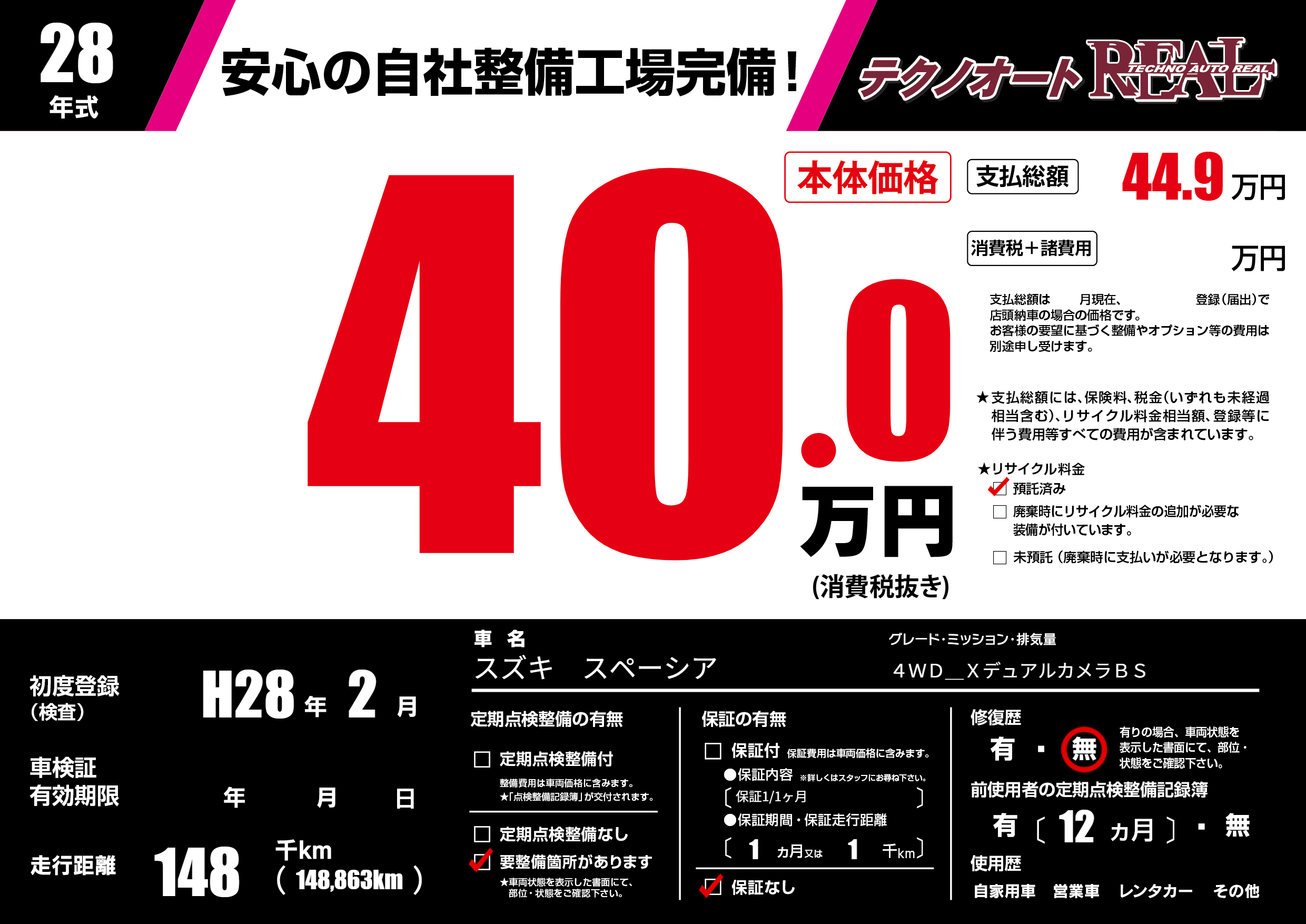 | 走行キロ | 14.8万km | 初年度登録 | H28年2月 |
