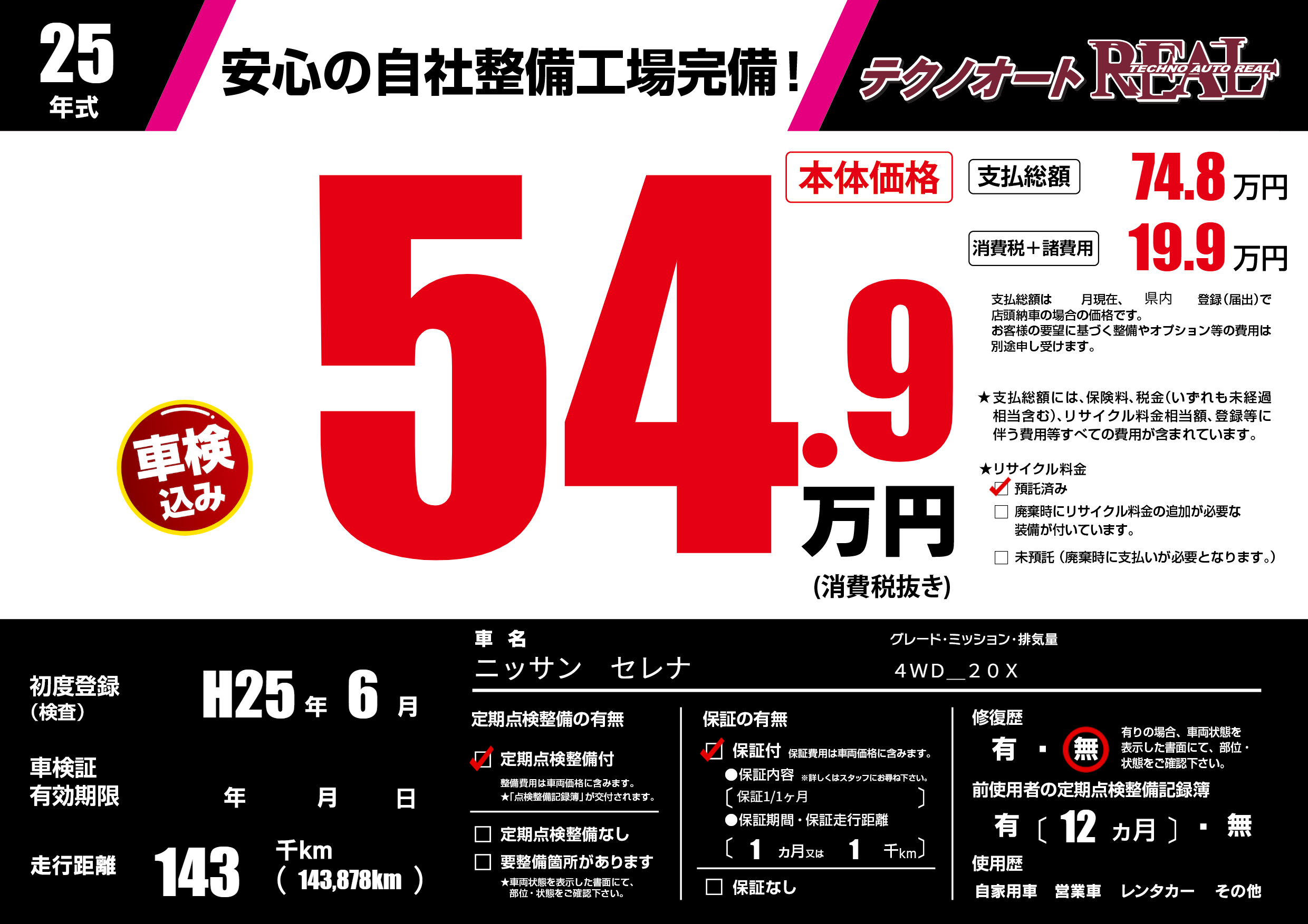 | 走行キロ | 14.3万km | 初年度登録 | H25年6月 |