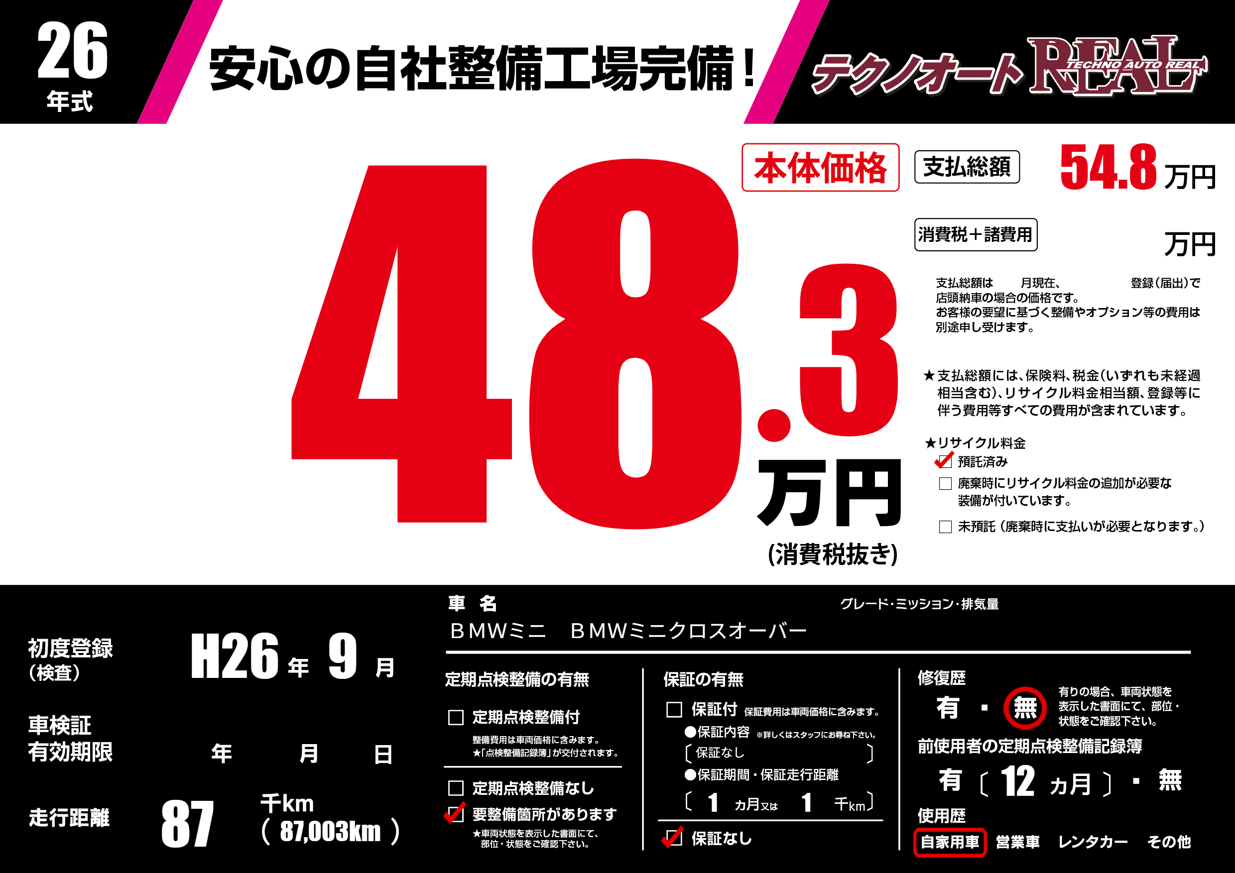 | 走行キロ | 8.7万km | 初年度登録 | H26年9月 |