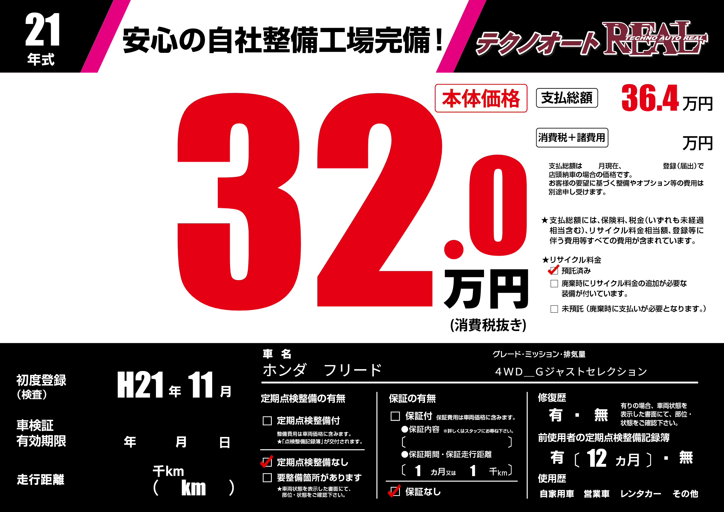 | 車名 | ホンダ フリード | グレード ミッション 排気量 |