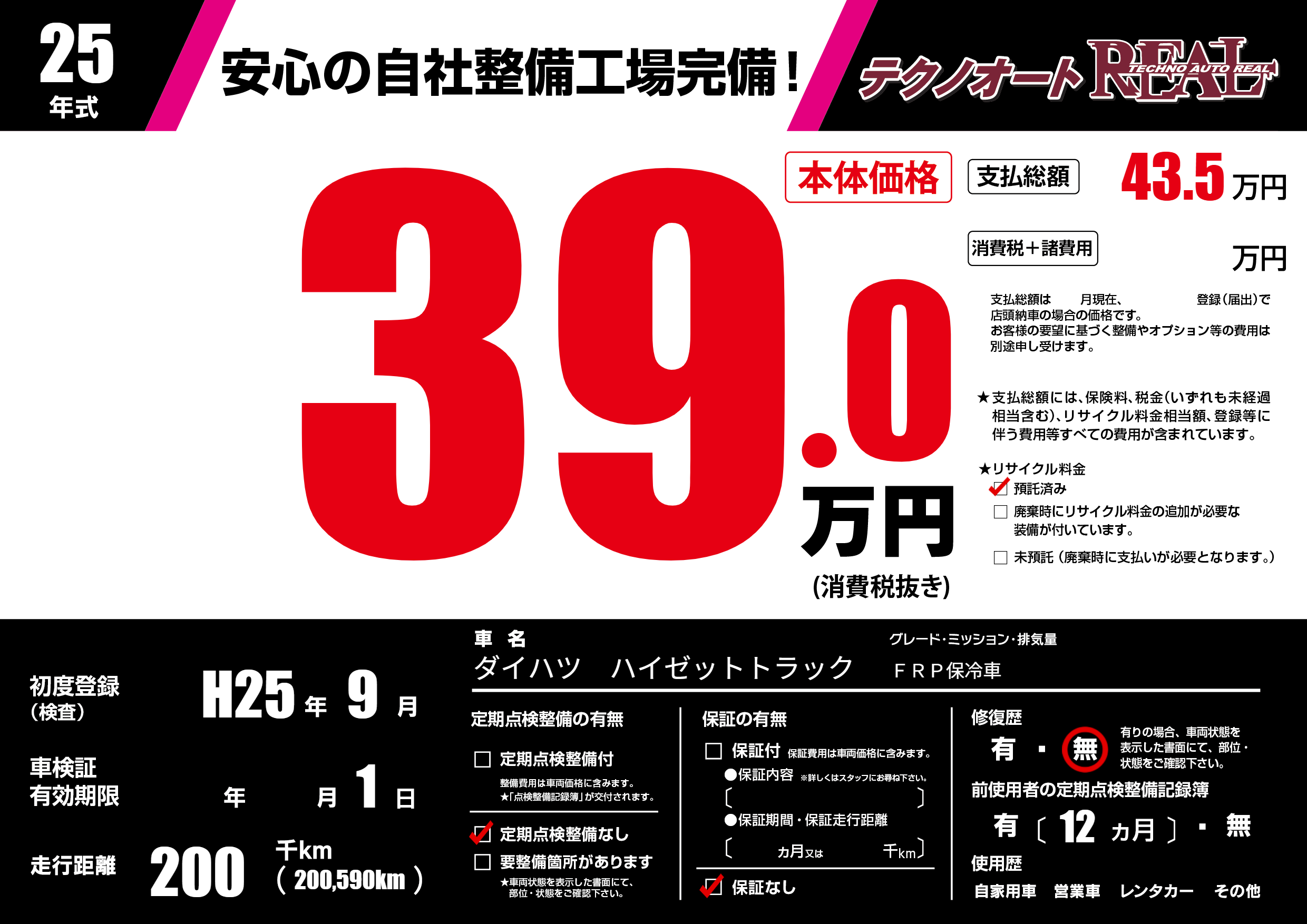 | 走行キロ | 20万km | 初年度登録 | H25年9月 |