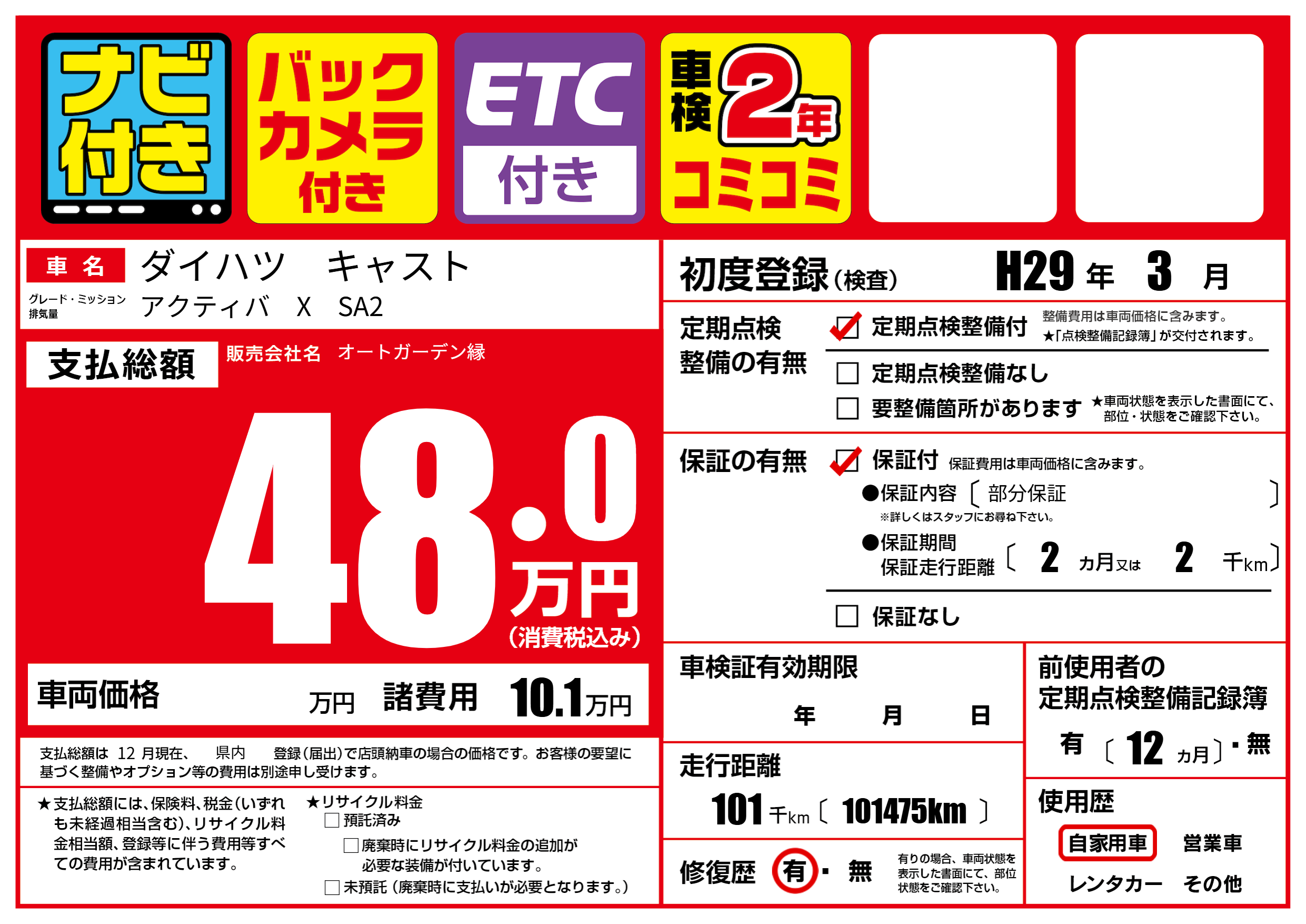 | 車名 | ダイハツ キャスト | グレード ミッション 排気量 |