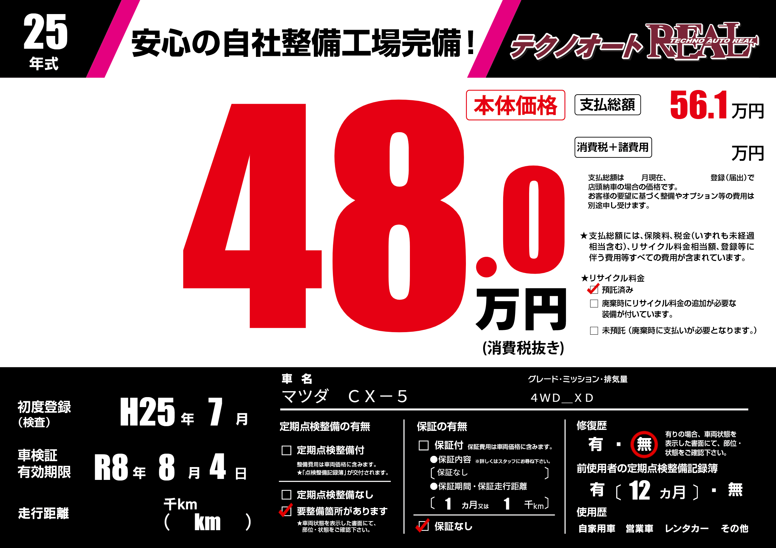| 走行キロ | - | 初年度登録 | H25年7月 |