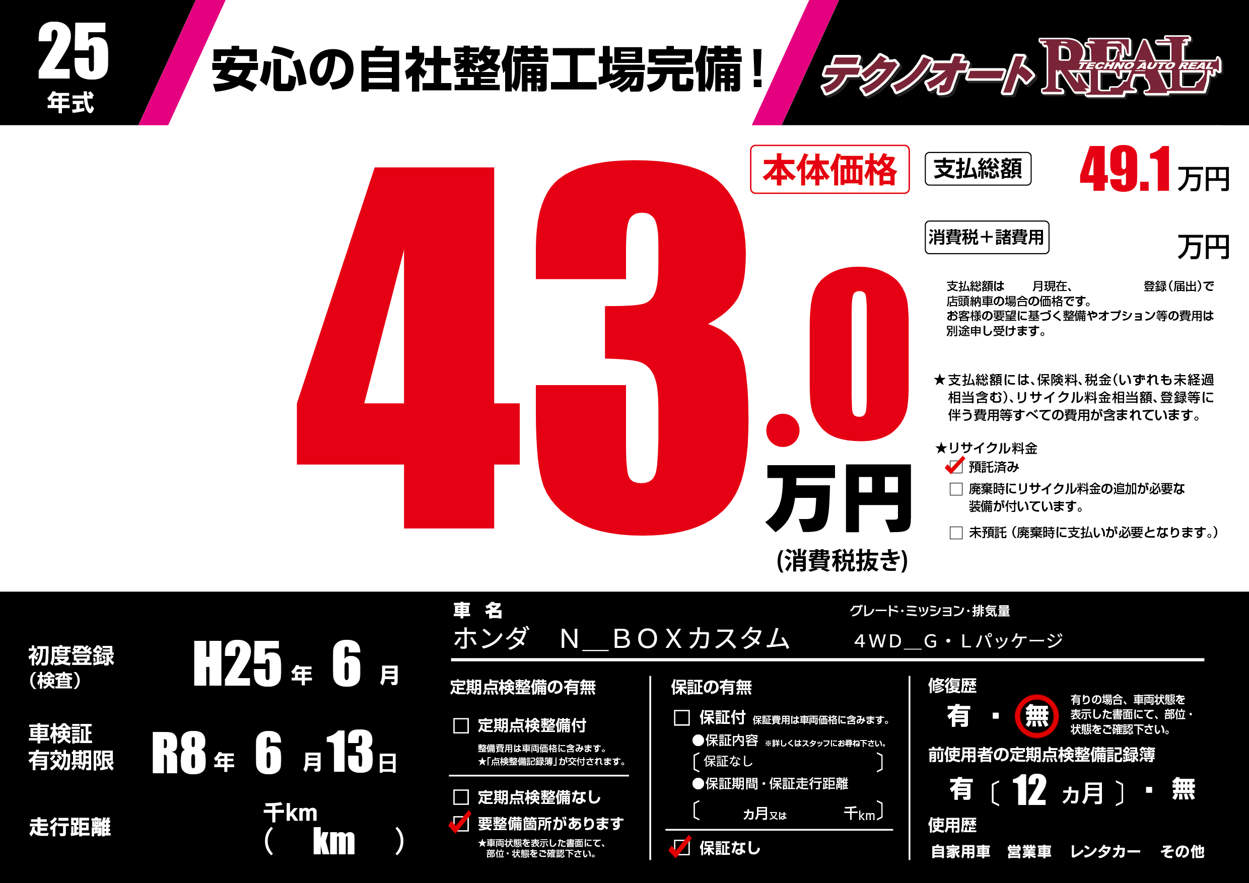 | 走行キロ | - | 初年度登録 | H25年6月 |