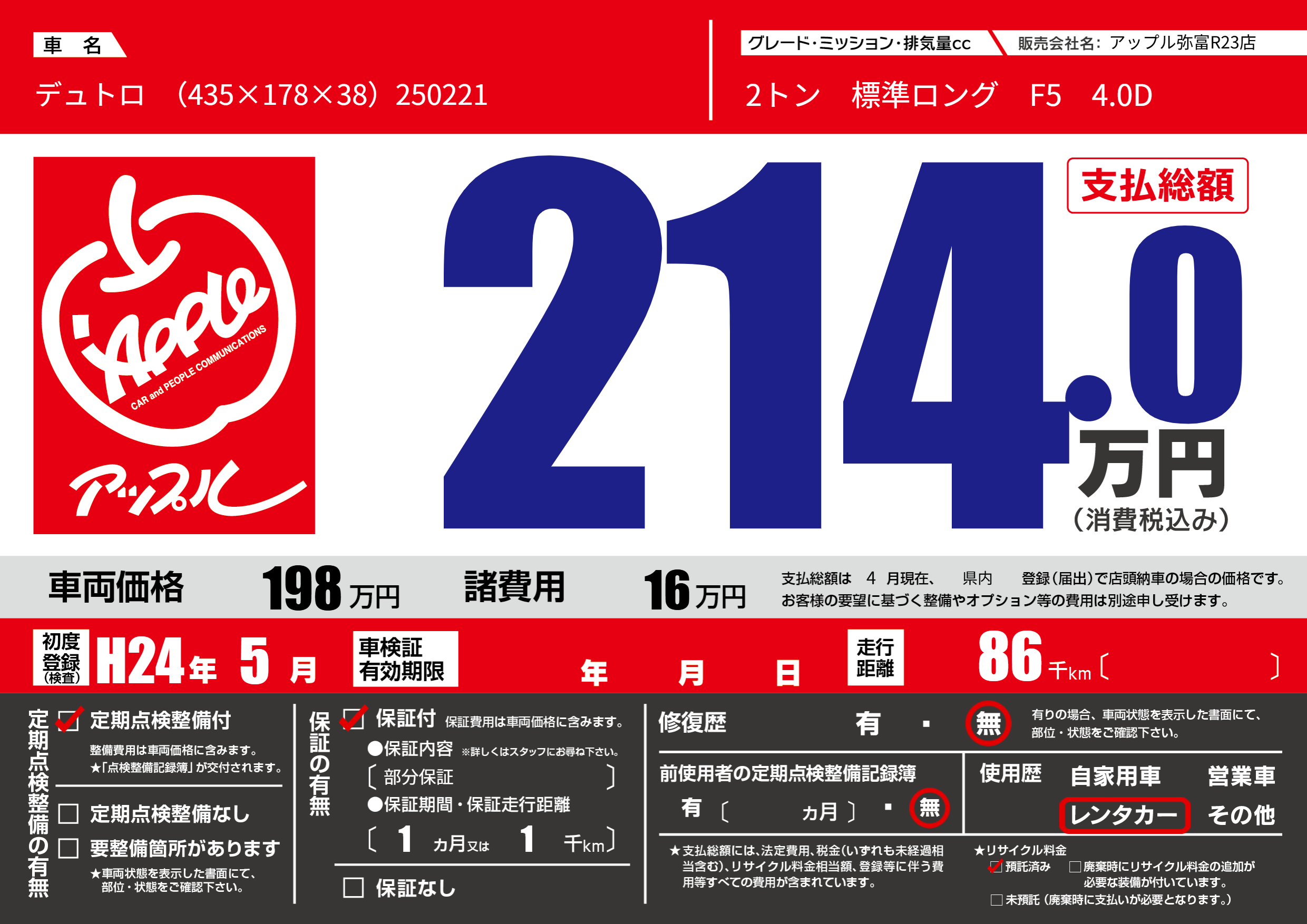 | 車名 | デュトロ (435×178×38)250221 | グレード ミッション 排気量 |