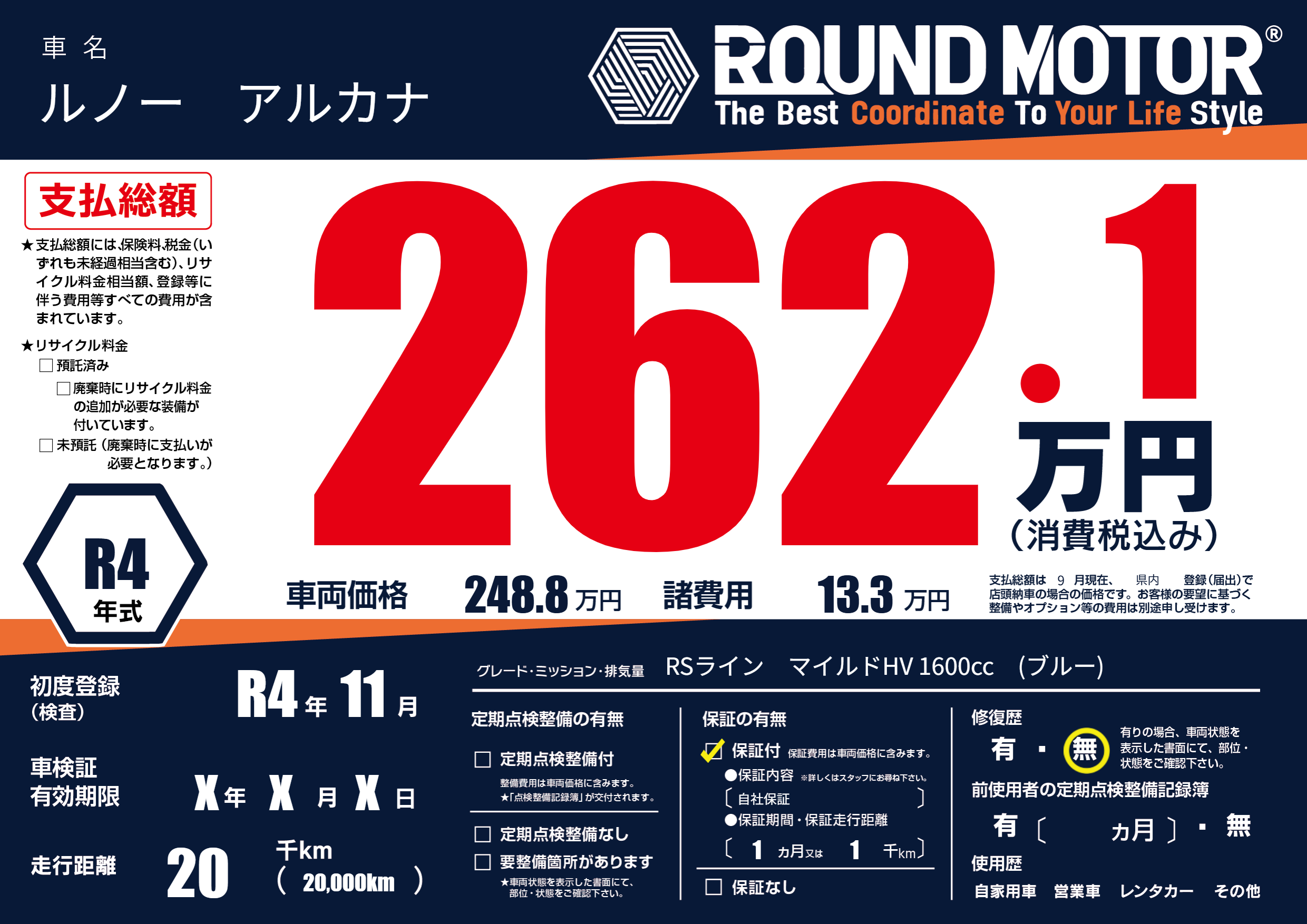 | 車名 | ルノー アルカナ | グレード ミッション 排気量 |