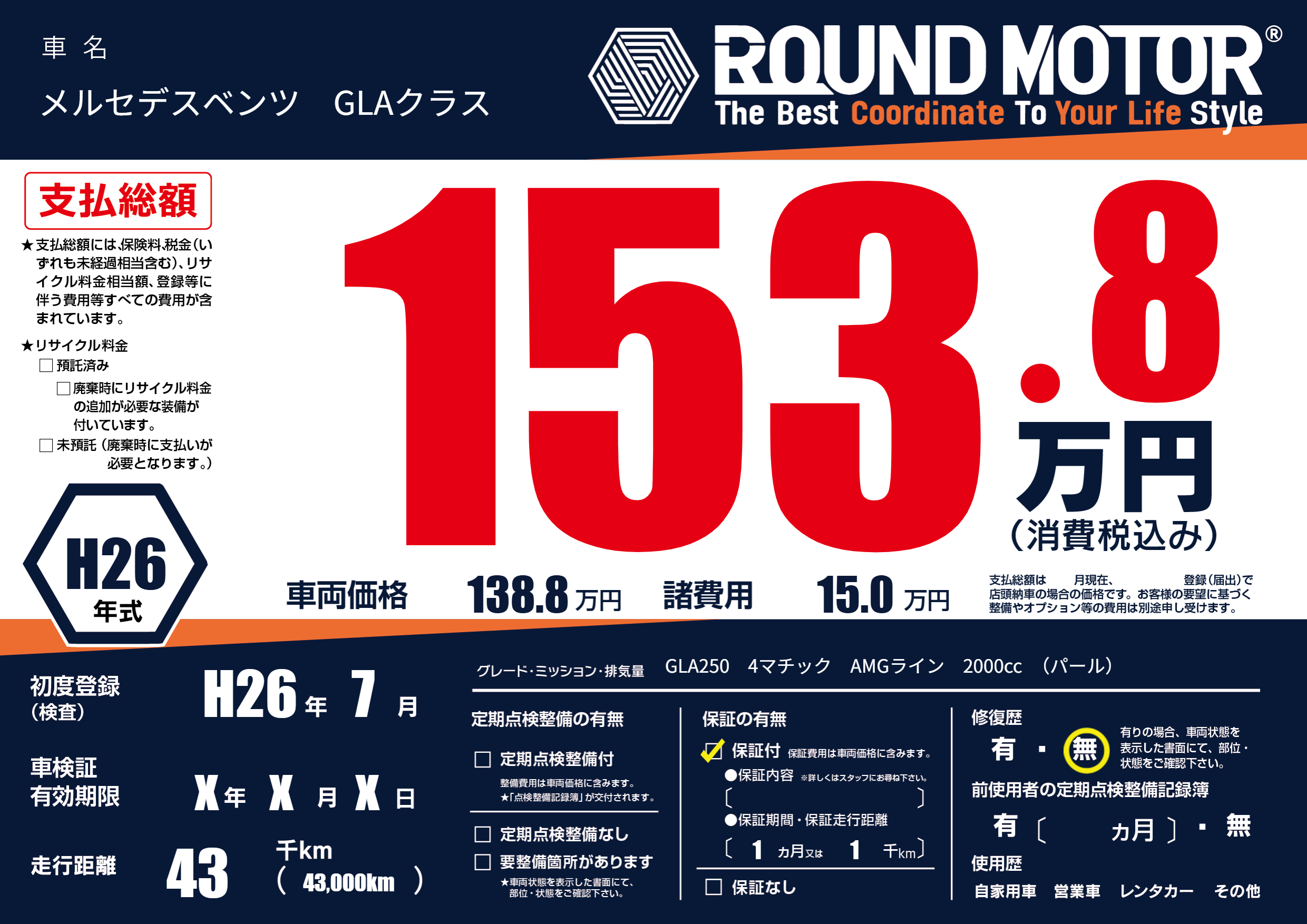| 車名 | メルセデスベンツ GLAクラス | グレード ミッション 排気量 |