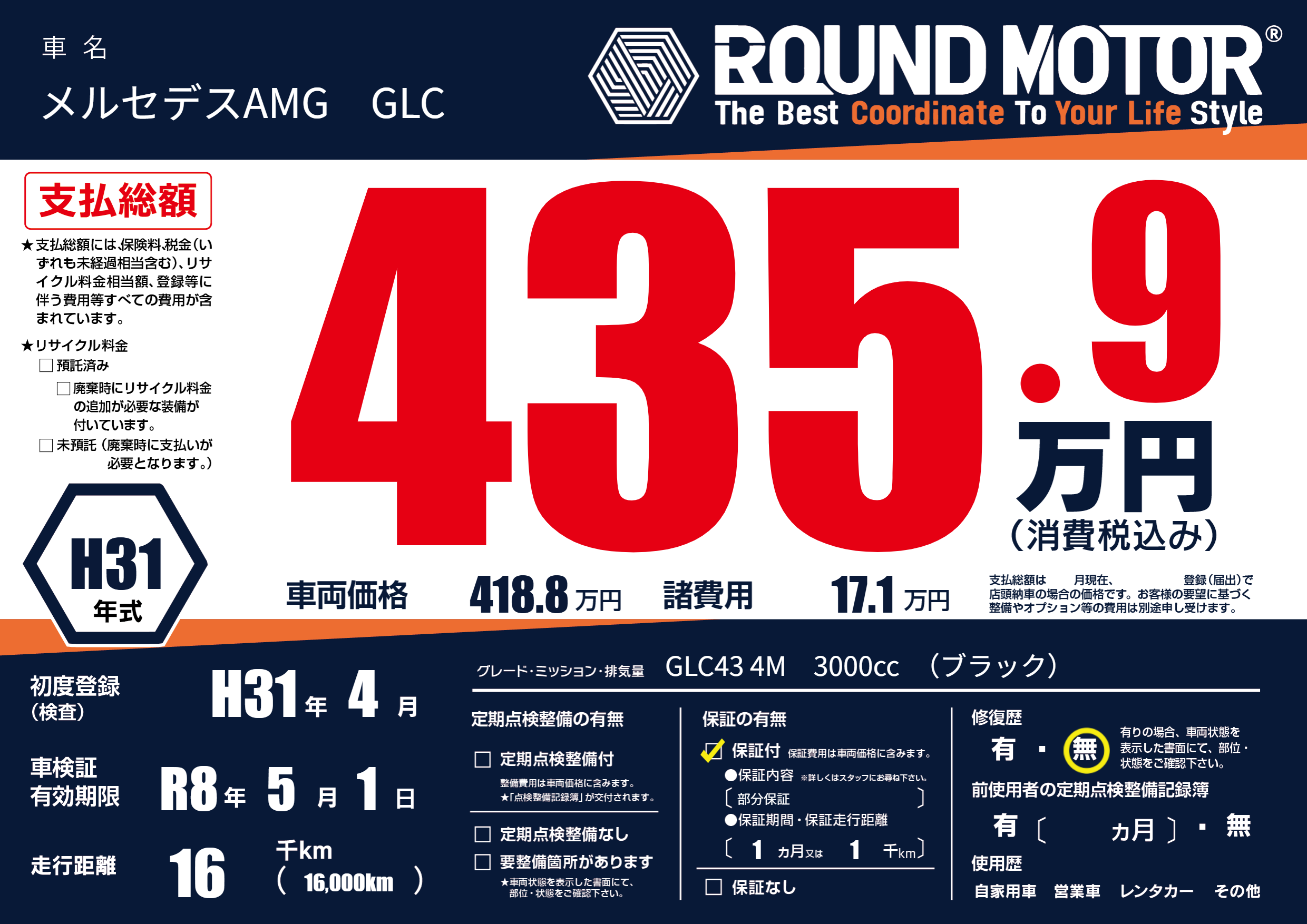 | 車名 | メルセデスAMG GLC | グレード ミッション 排気量 |