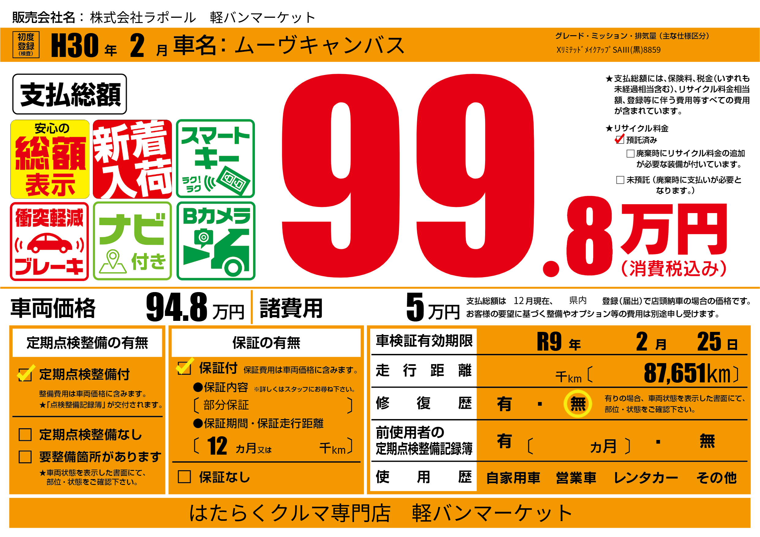| 走行キロ | - | 初年度登録 | H30年2月 |
