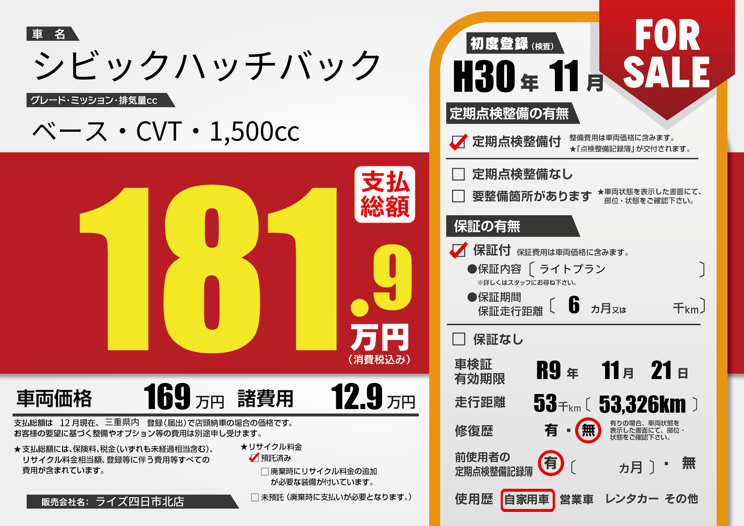 | 車名 | シビックハッチバック | グレード ミッション 排気量 |