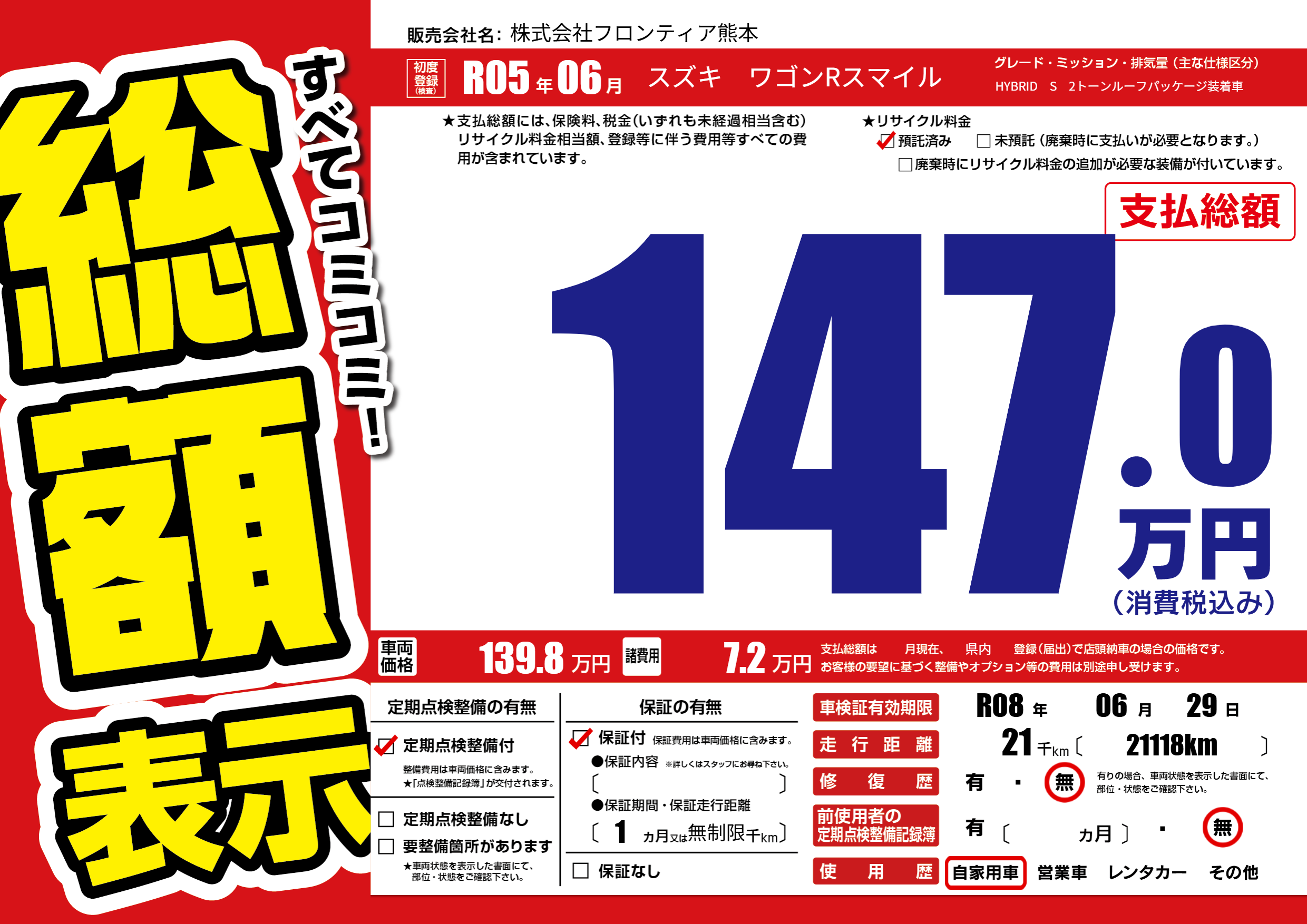 | 車名 | スズキ ワゴンRスマイル | グレード ミッション 排気量 |